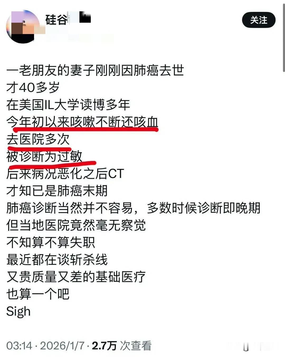 这些润去美国硅谷的华人精英也不过如此,面对美国的医疗的铁拳,这些华人精英也学会了认命,这个润人因为不断咳嗽,甚至还咳血,身边有同事家人肺癌去世,所以它很担心,多次去医院,都被告知是过敏,想问美国医生开个单子,要自费去CT,但是美国医生不给开,说是不能过度检查,然后还安慰自己心大,不CT就不CT,反正美国医疗就是人性化满满,结果病情恶化后化疗,才知道已经肺癌晚期了,但是它还是安慰自己,肺癌大多数是发现都是晚期,只是埋怨了一下不知道美国医生这样算不算失职,然后说美国又贵质量又差的基础医疗应该是一个斩杀线吧! 为什么这些润人去了美国,不管多么精英,在美国都不敢闹,都非常通情达理,因为它们闹,谁会管它们,没人会在意它们的感受,而且你赶闹,美国警察可不会惯着它们,所以它们只能在网上默默安慰自己,对美国还不能批评得太过,要不然就无法在我们面前保持优越感了,它这个事情要是放在国内,它们百分百会去闹的,要医院赔钱的!