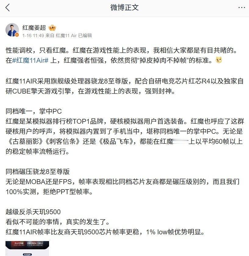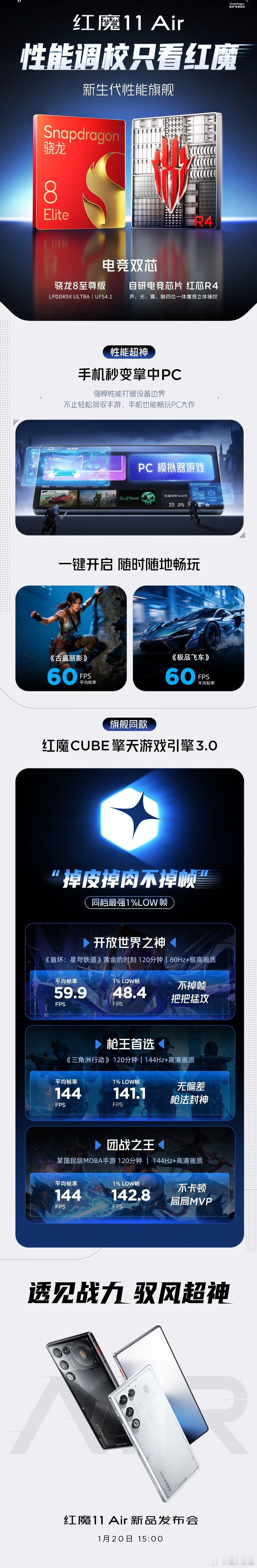 【红魔 11 Air 新机官宣贯彻“掉皮掉肉不掉帧”标准,将越级反杀天玑 9500】红魔游戏手机产品总经理姜超对红魔 11 Air 的性能进行预热,宣称新机将依然贯彻“掉皮掉肉不掉帧”的标准。据介绍,红魔 11 Air 采用旗舰级处理器骁龙 8 至尊版 + 自研电竞芯片红芯 R4 ,并内置独家自研 CUBE 擎天游戏引擎。姜超表示,红魔是某模拟器排行榜 TOP1 品牌,将模拟器内置到了手机当中,无论是《古墓丽影》《刺客信条》还是《极品飞车》,都能在红魔 11 Air 上以平均 60 帧以上的稳定帧率流畅运行。他还透露,红魔 11 Air 帧率比友商天玑 9500 芯片帧率更稳,1% low 帧优势明显,号称越级反杀天玑 9500。
