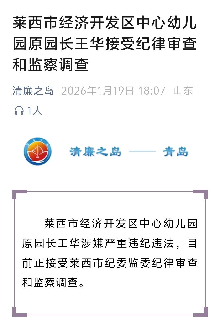青岛莱西市经济开发区中心幼儿园原园长王华涉嫌严重违纪违法,目前正接受莱西市纪委监