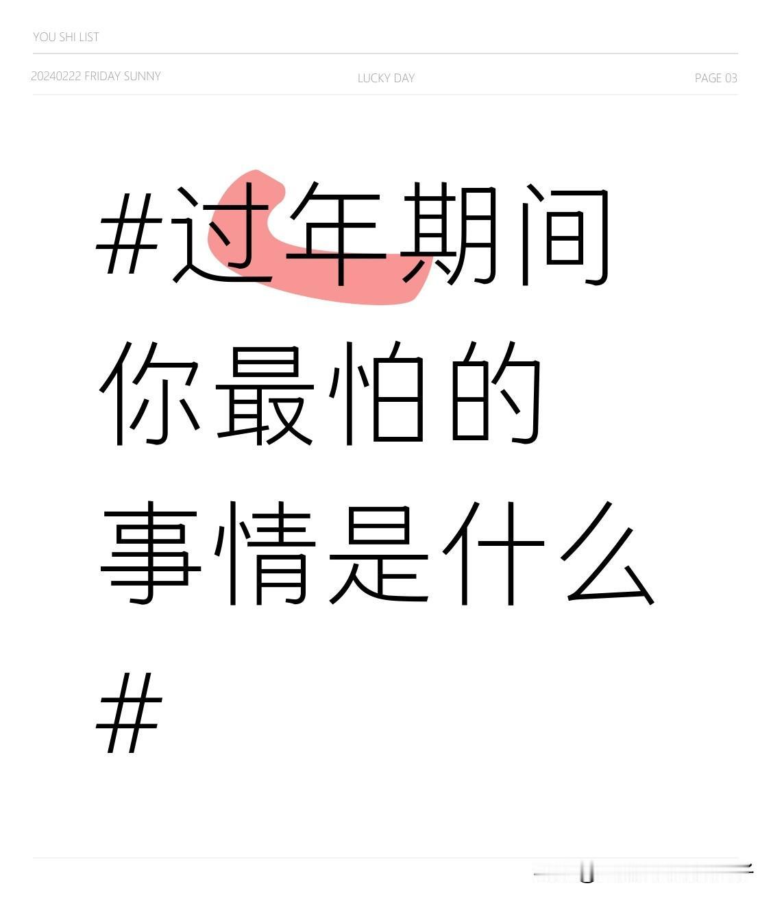 过年期间你最怕的事情是什么 过年本是团圆喜庆的日子,可我最怕走亲戚和被催婚。走亲戚时,一堆长辈围过来,那盘问架势就像我是嫌疑人。问工作咋样、收入多少,回答得小心翼翼,生怕说错话。要是说工作一般、工资不高,他们表面安慰,背后可能就开始议论。 催婚更是要命,七大姑八大姨一开口就围绕对象、结婚。我才二十出头,感觉自己还是孩子,他们却觉得我再不结婚就晚了。每次都得绞尽脑汁应付,真希望过年能少点这些压力。