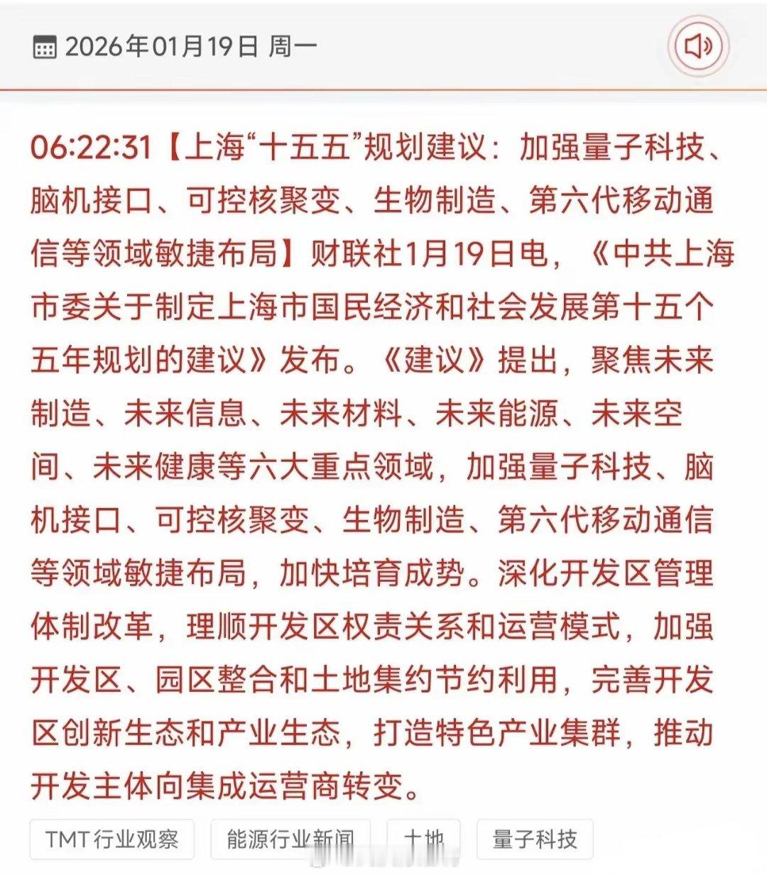 🔥上海“十五五”规划重磅!六大未来产业+五大黑科技,你的投资方向找准了吗?今天(1月19日),上海抛出经济新引擎!“十五五”规划建议正式落地,聚焦未来制造、未来信息、未来材料、未来能源、未来空间、未来健康六大领域,量子科技、脑机接口、可控核聚变、6G通信等五大前沿技术成“敏捷布局”核心。这不仅是上海的发展蓝图,更是未来五年经济与投资的风向标!📈对经济:从制造到智造的跨越新质生产力落地:告别传统要素驱动,量子科技重塑计算范式、可控核聚变探索能源革命、6G构建空天地一体化网络,这些领域将催生万亿级新赛道,带动上下游全产业链升级。长三角协同提速:上海作为龙头,将通过开发区改革、产业集群建设,辐射江苏、浙江等地,形成“核心研发+配套生产”的区域经济联动效应。💰对股市:四大主线藏机遇政策指向就是资金方向,这些板块或成未来五年牛市主角:量子科技与6G(未来信息):关注光通信、卫星互联网、量子加密产业链,技术突破将带来持续催化。脑机接口(未来健康):医疗与人机交互革命,医疗器械、神经科学相关标的有望获资金青睐。可控核聚变(未来能源):超导材料、高端磁体等配套产业已开始受益,商业化进程值得长期跟踪。上海本地科创股:张江高科、临港开发区等园区平台,以及承担开发任务的国企,将直接受益政策落地。机会是留给有准备的人的,但不要盲目冲进去当接盘侠。这种大政策出来,主力资金会先动,咱们散户要做的,是先关注、后观察,等股价回调企稳了,再结合公司的业绩慢慢布局。大家怎么看?你觉得脑机接口和可控核聚变,哪个会先走进我们的生活?