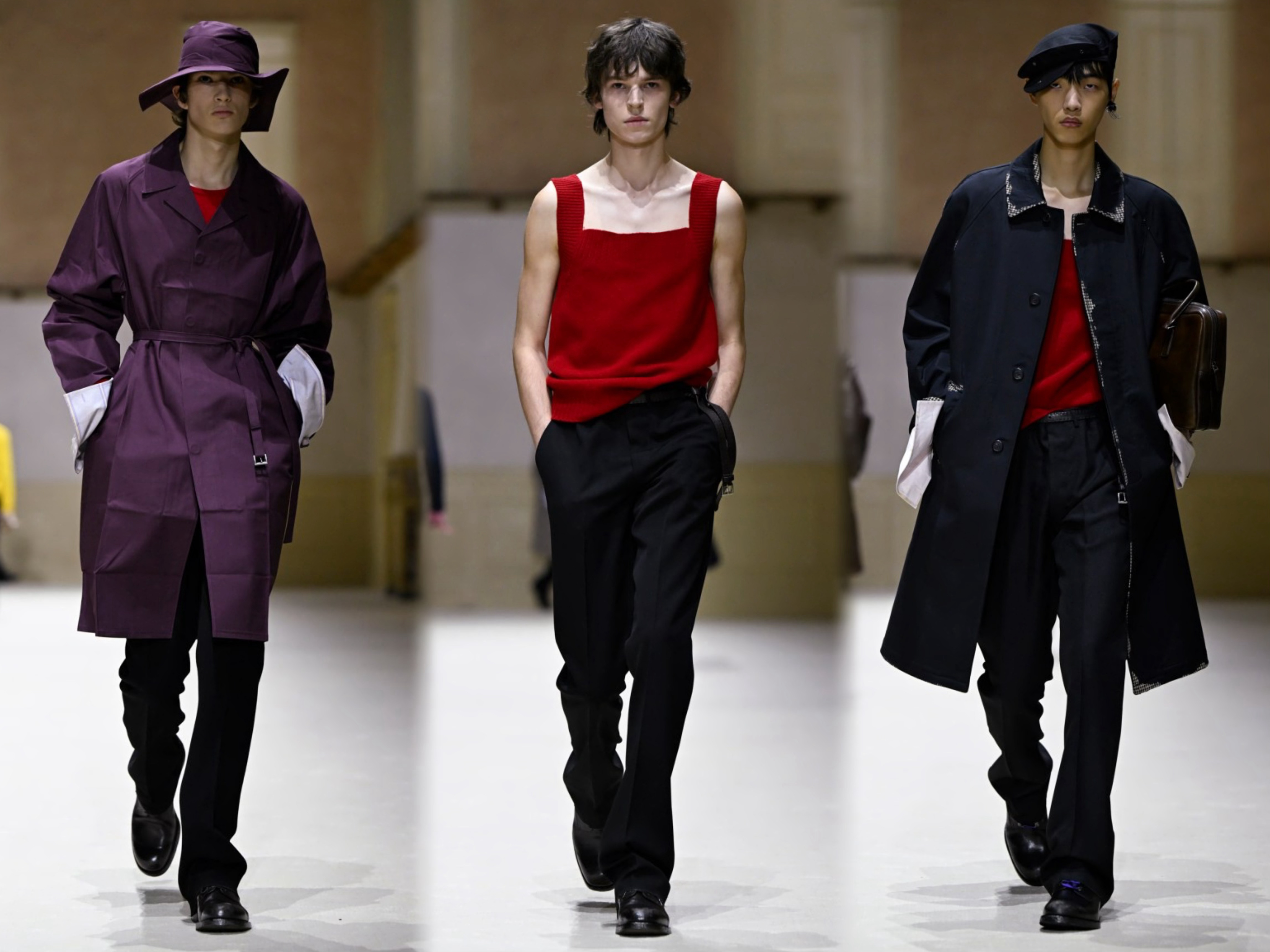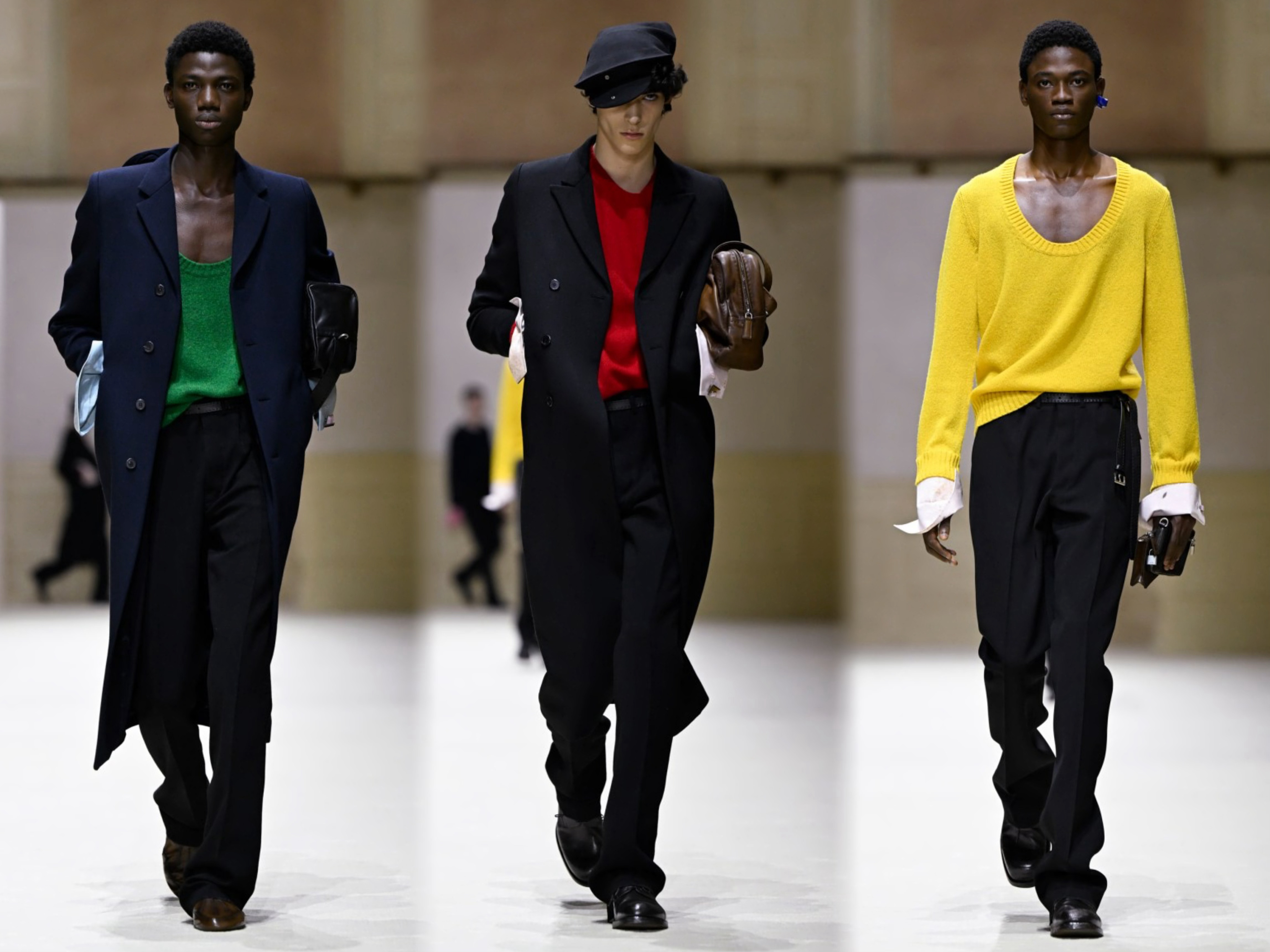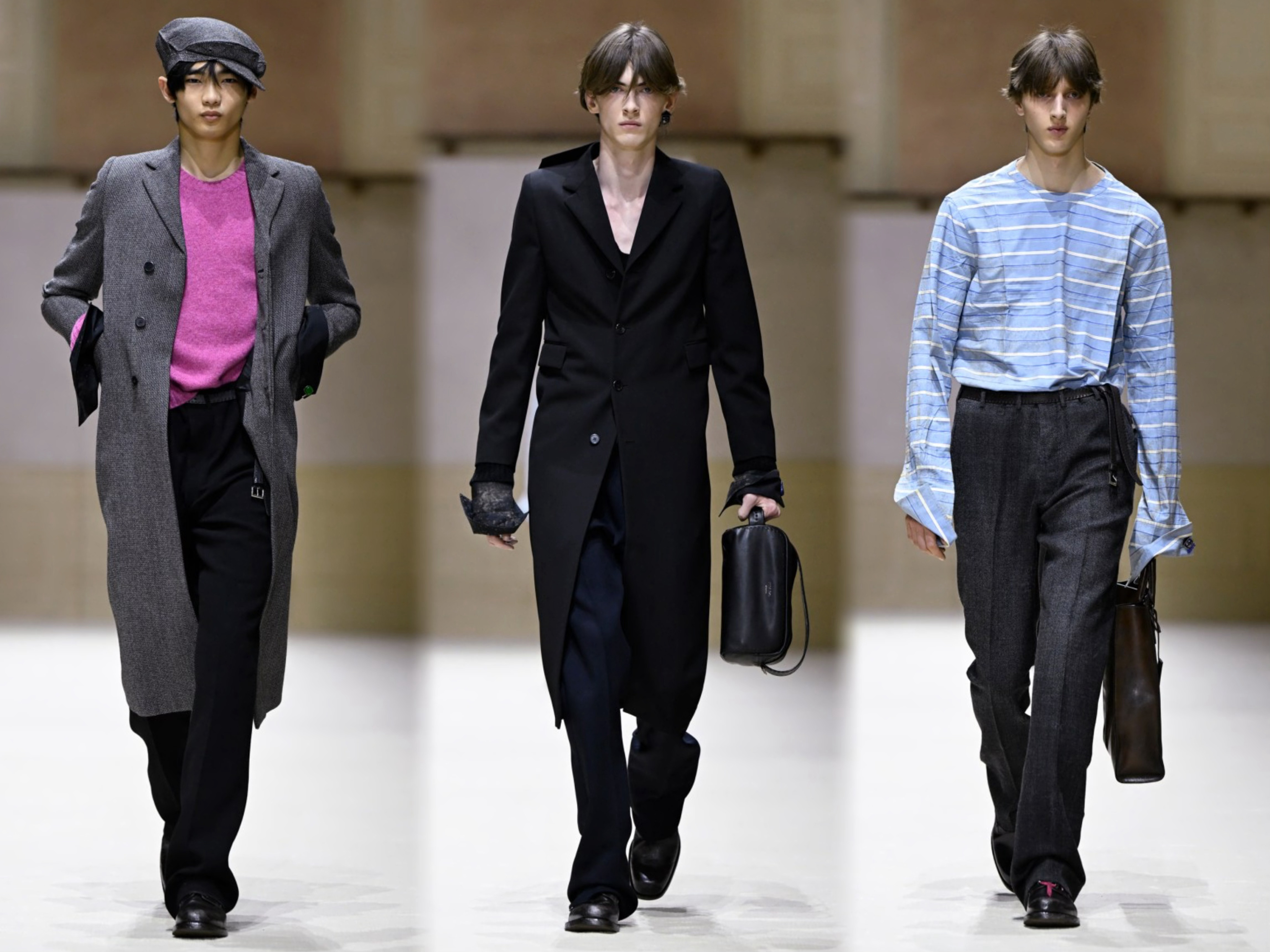 Prada Menswear F/W 2026 米兰男装周 Miuccia Prada与Raf Simons共同打造的2026秋冬男装系列,在回响着集体过往的印记中,探索新设计语言。解构经典元素,用简洁线条与修长廓形重塑大衣和西装,将细节巧思呈现于袖口,采用松垂或烫焦的质感处理,打造出慵懒与精致的反差感;再叠搭明亮彩色和拼贴印花,以及渔夫帽、报童帽、针织背心… 各种单品配饰点缀,不经意间呈现的“不完美”着装风格,透着冷静克制的文艺气息。完美的将致敬与创新融合,普拉达男装衣橱变得实用而有趣。两位品牌代言人贾玲、马龙亮相秀场,来自不同领域的面孔,也契合品牌时尚的多元表达。男装周