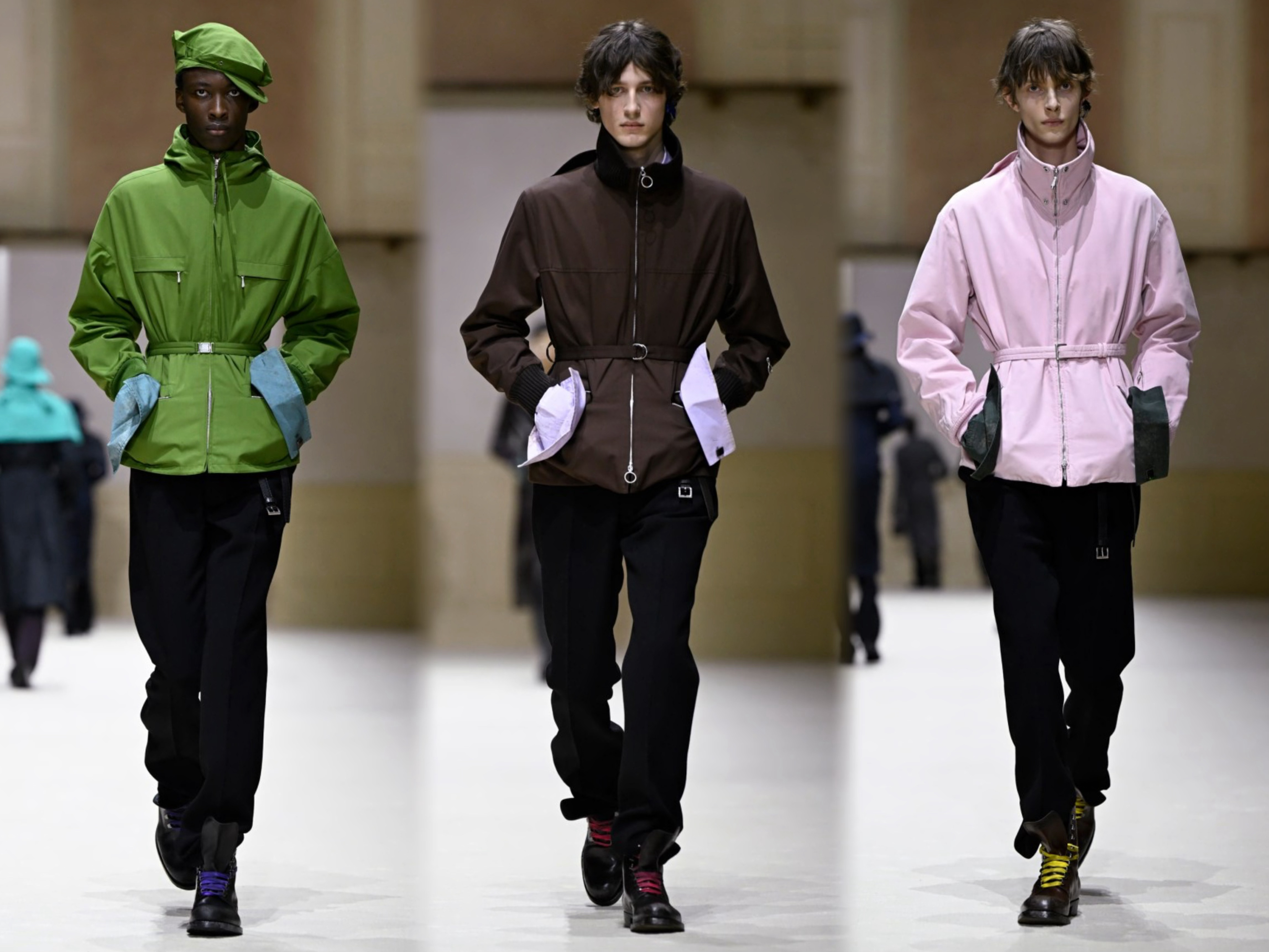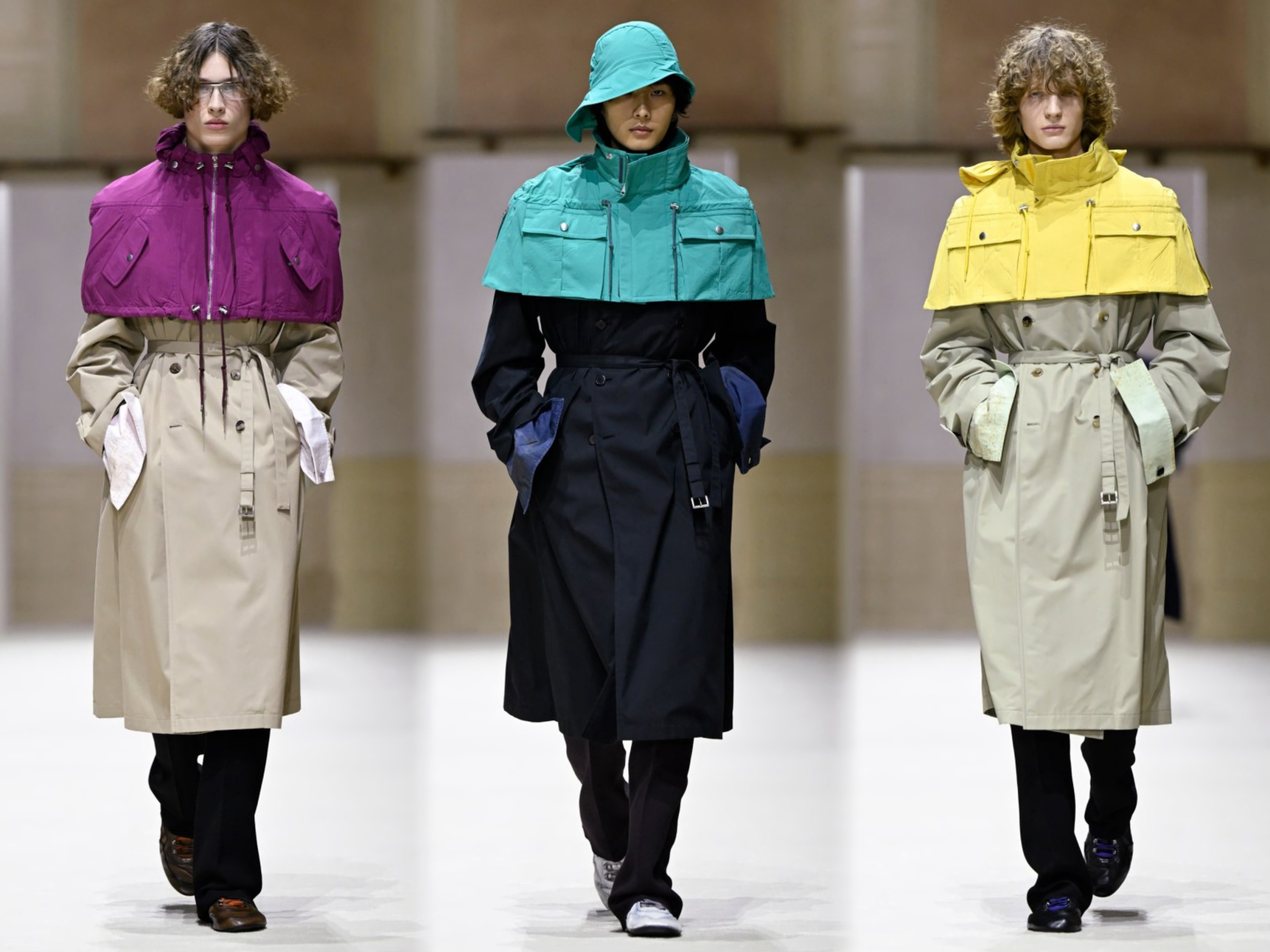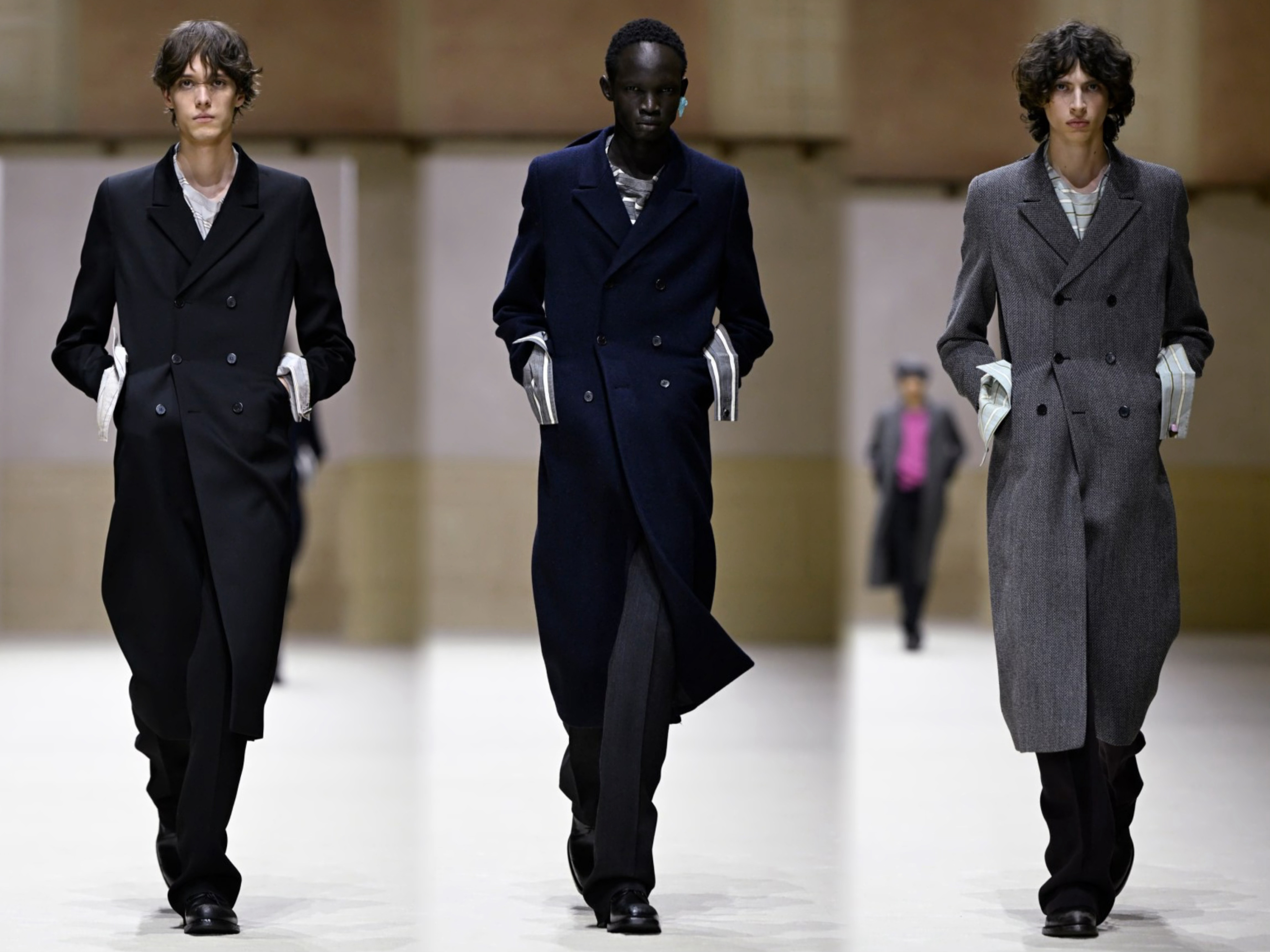 Prada Menswear F/W 2026 米兰男装周 Miuccia Prada与Raf Simons共同打造的2026秋冬男装系列,在回响着集体过往的印记中,探索新设计语言。解构经典元素,用简洁线条与修长廓形重塑大衣和西装,将细节巧思呈现于袖口,采用松垂或烫焦的质感处理,打造出慵懒与精致的反差感;再叠搭明亮彩色和拼贴印花,以及渔夫帽、报童帽、针织背心… 各种单品配饰点缀,不经意间呈现的“不完美”着装风格,透着冷静克制的文艺气息。完美的将致敬与创新融合,普拉达男装衣橱变得实用而有趣。两位品牌代言人贾玲、马龙亮相秀场,来自不同领域的面孔,也契合品牌时尚的多元表达。男装周