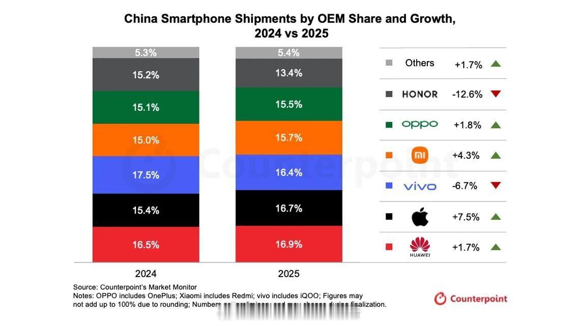 华为重夺中国手机市场份额第一 天塌了,兄弟们,Counterpoint的数据也是华为手机出货量国内第一。IDC、Omdia(Canalys)、IDC的2025年中国手机出货量都是华为、苹果、vivo前三名,都是华为第一名。另外这三个机构统计的都是出货量。华为时隔五年重夺中国手机第一