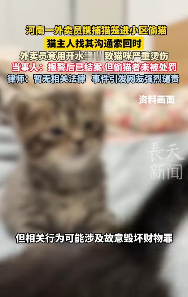 “太缺德了!”1月17日,河南开封,一外卖员带捕猫笼,偷走居民养的宠物猫,主人发现后找他沟通要回,外卖员不仅不还,还用开水浇淋,导致小猫严重烫伤,当女子报警想讨回公道时,却很快结案,外卖员也没收到任何处罚。网友:骨子里的坏! 事儿说起来让人揪心,当天这名外卖员显然是有备而来,随身携带捕猫笼,目标明确地盯上了居民家那只才10个月大的小猫,趁着没人注意,他顺利把小猫装进笼子偷走,没成想刚得手就被猫主人发现了。 猫主人看着自家爱宠被关在笼子里,又急又气,只能放低姿态和外卖员沟通,一遍遍地好言相劝,就盼着他能良心发现,把小猫还回来。 换作稍微有点良知的人,被当场撞见偷东西,要么赶紧道歉还回去,要么找借口脱身,可这外卖员偏不,面对主人的哀求,他不仅毫无动容,反而态度愈发恶劣,见主人不肯放弃,竟然做出了更残忍的事,他找来一壶烧开的开水,当着主人的面径直朝着笼子里的小猫泼了下去,这一下不仅烫得小猫发出凄厉的惨叫,也彻底击碎了主人的期盼。 现场的情景惨不忍睹,滚烫的开水浇在小猫身上,它脑袋和脊背上的毛发瞬间就被烫得脱落,原本粉嫩的皮肤当场红肿溃烂,血肉模糊看着就让人揪心。 猫主人眼睁睁看着爱宠遭此毒手,心如刀绞,却又来不及阻止,只能赶紧上前护住小猫,随后第一时间报警,希望能通过法律讨回公道,让施暴者付出应有的代价。 报警后猫主人马不停蹄地把重伤的小猫送往宠物医院抢救,仅仅是前期的治疗费用,就花了差不多5000元,医生检查后说小猫伤势严重,后续还需要做植皮手术,而且那些被开水烫毁的皮肤区域,这辈子都再也长不出毛发了,好好一只活泼可爱的小猫,就因为外卖员的恶毒行径,不仅要忍受剧痛,还落下了终身残疾。 更让人愤怒的是,外卖员施暴后还十分嚣张,毫无愧疚之意,甚至大言不惭地说自己对猫有心理阴影所以才要虐猫,这哪里是什么心理阴影,分明就是人性泯灭,是刻在骨子里的坏,对毫无反抗能力的小动物下这么狠的手,足见其内心的暴戾和残忍。 猫主人搜集了现场的证据,满心期待警方能主持公道,给受伤的小猫一个说法,可没曾想案子处理得异常迅速,很快就结了,结果却让人跌破眼镜,警方表示目前缺乏专门的反虐待动物相关法律依据,没法对该外卖员进行处罚,他就这么逍遥法外,依旧正常送外卖,仿佛什么都没发生过。 这个结果一出来,瞬间引发了全网热议,网友们个个怒不可遏,纷纷吐槽这外卖员是骨子里的坏,有人质疑,就算没有反虐待动物法,小猫也是主人的私有财物,外卖员偷猫还故意损坏,这也构成故意损坏他人财物了,怎么就能毫无处罚? 还有人担忧,面对比自己弱小的生命都能下此狠手,这种暴戾之徒在社会上就是定时炸弹,今天能虐猫,明天和人起冲突,说不定就会用同样恶毒的手段伤人。 想想就觉得后怕,这个施暴的外卖员没有受到任何约束,依旧穿着外卖服穿梭在各个小区、街巷,说不定此刻就正在别人居住的小区里晃悠,谁也不知道他下次会不会因为一点小事,就再次做出极端的事来。 而那只可怜的小猫,还躺在宠物医院里,每天忍受着打针换药的剧痛,猫主人看着爱宠遍体鳞伤的模样,心里的痛苦更是难以言说。 其实大家愤怒的,不只是外卖员的缺德行径,更是这种恶行得不到惩治的无奈,对小动物的态度,最能反映一个人的品性,连弱小生命都不懂得尊重、肆意伤害的人,根本不配得到社会的包容,可偏偏因为相关法律的缺失,让这种坏人钻了空子,不用为自己的行为付出任何代价。 直到现在,那只小猫还在医院接受治疗,而施暴的外卖员却依旧我行我素,这事儿就这么不了了之,实在太不合理,希望能有更合理的处理结果,给受伤的小猫和伤心的主人一个交代,也让那些心怀恶意、肆意伤害弱小的人,明白作恶终究要付出代价。 (信息来源:《痛心!外卖员偷走女子家的猫后 用开水浇淋虐待 女子:已结案 构不成对偷猫者处罚》长天新闻)