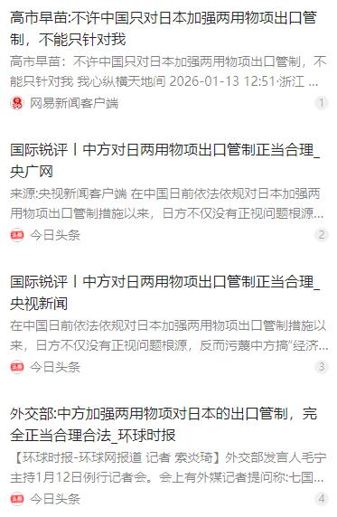 这一次就连英国也没想到,高市早苗在面对着中国管制对日出口两用物项一事上,直接将西方国家也牵连了进来,直接公开发言认为中国单独针对日本不合法,应该对其他国家也一视同仁 麻烦看官老爷们右上角点击一下“关注”,既方便您进行讨论和分享,又能给您带来不一样的参与感,感谢您的支持! 2026 年 1 月初,中国商务部发布的一则出口管制公告,在东亚乃至全球政坛掀起了不小的波澜。这份编号为 2026 年第 1 号的公告明确提出,为维护国家安全和履行防扩散义务,禁止所有两用物项对日本军事用户、军事用途及相关最终用户出口,公告自发布之日起正式生效。 谁也没料到,日本政客高市早苗会用如此激进的方式回应此事。1 月 11 日,她在 NHK 的一档节目中公开炮轰中国的管制措施,声称中方 “只针对日本” 的做法 “与国际惯例大相径庭”,“无法容许”,甚至要求中国若要实施此类管制,就该对西方国家 “一视同仁”,不能单独点名日本。 这一番言论直接把西方国家推到了风口浪尖,连英国等欧洲国家都倍感意外。高市早苗的算盘很明显,就是想拉着西方盟友一起向中国施压,可她忘了,中国的管制措施根本不是 “单独针对日本”,而是精准锁定 “军事用途” 这一核心。 中国从来没在公告里把日本列为唯一管制对象,而是明确针对 “军事用户、军事用途以及提升军事实力的最终用户”,不管哪个国家,只要触及这个红线,都在管制范围内。高市早苗故意混淆概念,说白了就是想回避日本自身的问题。 要搞清楚这事儿的来龙去脉,得先明白什么是 “两用物项”。按照中国相关条例,这类物资既有民用功能,又能用于军事领域或提升军事潜力,比如稀土磁体、高端机床、半导体材料等,都可能成为制造先进武器的关键部件。 中国这次出手,绝非凭空而为,而是日本长期危险动向的必然结果。近年来,日本一直在加速 “再军事化”,2026 年的防卫预算已经涨到 9 万亿日元,比五年前几乎翻了一倍,还计划修订 “安保三文件”,谋求所谓的 “反击能力”。 更让人警惕的是,日本一直在推动民用技术向军工领域转移。三菱重工、川崎重工这些企业,表面上造汽车、修电梯,背地里却在为自卫队生产战斗机、潜艇零件,高校的科研成果也频繁流向军事领域,这种 “军民融合” 早已突破了和平宪法的约束。 高市早苗本人的一系列言行更是触碰中国核心利益的关键。她多次公然宣称 “台湾有事就是日本有事”,明目张胆干涉中国内政,这已经不是简单的外交摩擦,而是对中国主权和领土完整的直接挑衅。 除此之外,日本的拥核野心也让国际社会忧心忡忡。目前日本拥有 47 吨分离钚储备,远超民用核电需求,足够制造 6000 枚核弹头,其政府高官还曾公开发表拥核言论,推动 “核共享” 构想,把地区推向核风险边缘。 在这样的背景下,中国依据《出口管制法》实施管制,完全是正当合理的自保行为,既符合国际通行的 “最终用户控制” 原则,也是在履行防扩散的国际义务。外交部发言人毛宁早已明确表态,中方的举措完全正当合理合法。 可高市早苗却选择性忽略这些事实,反而倒打一耙,试图把西方国家拖进这场争端。她以为喊着 “一视同仁” 就能让欧美国家站在日本这边,却没考虑到西方盟友的处境有多尴尬。 西方国家心里跟明镜似的,自己也经常搞出口管制。美国去年刚禁止向中国出口 14 纳米以下芯片,欧盟至今限制高端光刻机对华出口,这些措施都是针对性极强的单边行动,现在高市早苗让中国对西方国家 “一视同仁”,无异于让他们自己打自己的脸。 更重要的是,中国的管制措施法理依据充分、精准度极高,没有任何可指摘的地方。西方国家要是支持日本,就等于否定自己一贯的管制政策;要是反对日本,又会破坏盟友关系,只能在外交回应上含糊其辞,陷入两难境地。 中国的管制措施,精准击中了日本军工体系的 “七寸”。日本 85% 的钐钴磁体依赖中国进口,这种材料是 F-35 战斗机雷达、潜艇发动机的核心部件,70% 的钨也来自中国,而钨是制造穿甲弹的关键原料,失去这些供应,日本的军备扩张计划直接被卡住脖子。 受此影响,日本相关企业和资本市场已经出现明显波动。管制生效后短短几天,日本稀土概念股、精密机械板块股价大幅下跌,丰田、索尼等企业因为供应链与军工领域存在关联,纷纷陷入焦虑,经济界更是联名上书,要求政府保持冷静。 这些企业慌的不是民用生产受影响,而是他们的供应链早已和军工深度绑定,现在中国要求购买相关物资必须证明 “不用于军事用途”,那些游走在军民两界的企业自然难以自圆其说。 高市早苗的言论不仅没得到西方支持,反而让日本内部出现分裂。不少日本民众和有识之士都清楚,右翼政客的军事冒进只会让日本陷入危险,经济界更是强烈反对把国家利益绑在战车上,毕竟和平发展才是日本的根本利益所在。