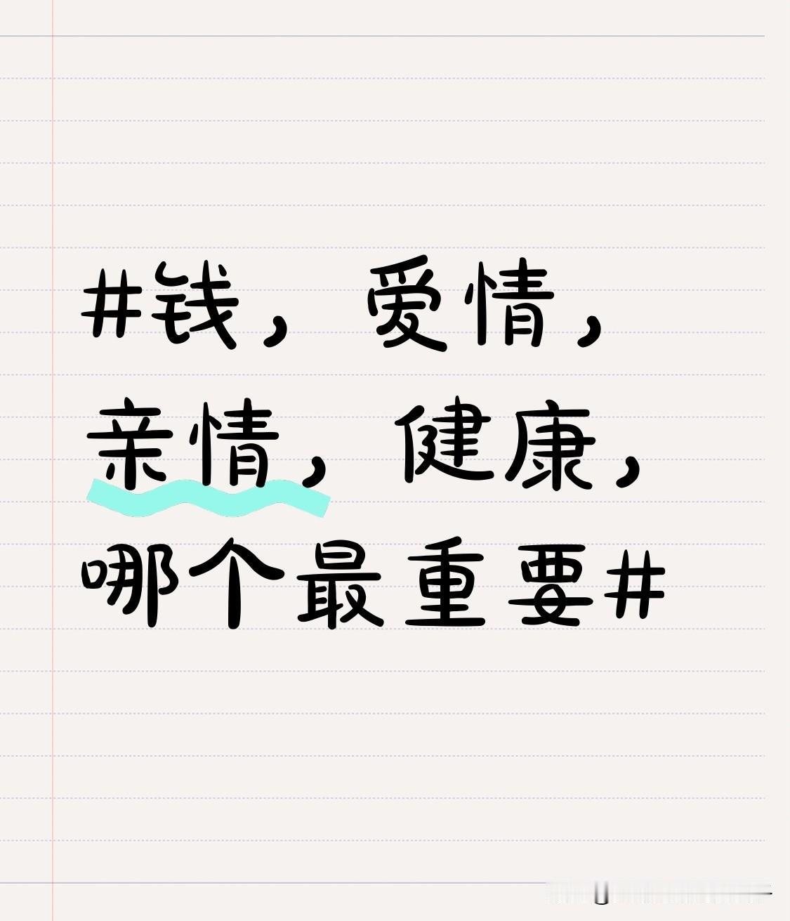 如果人生是场通关游戏,钱、爱情、亲情、健康就是核心装备。不同阶段,答案不同。 健康是地基。就像数字里的“1”,没了它,钱、爱情、亲情这些“0”再多也没用。ICU里的富豪,呼吸都靠管子,财富、爱人和子女陪伴也难有高质量生活。 钱是底气。它能解决生活中90%的烦恼,剩下的也能缓解。没钱,在给父母治病、守护爱情时都会很无力。 亲情是防线,爱情是点缀。但没了健康和钱,一切温情都可能苍白。所以,努力赚钱、照顾好健康,才配有亲情与爱情。
