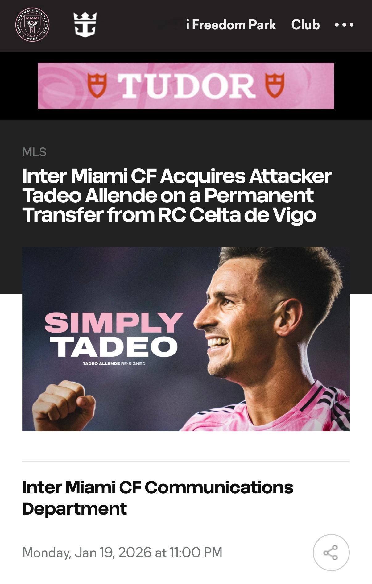 官宣|阿连德留下迈阿密国际从塞尔塔足球俱乐部永久签下前锋塔德奥·阿连德。迈阿密国际今天宣布,已从西甲球队塞尔塔永久签下前锋塔德奥·阿连德。阿连德将占用一个国际球员名额,他的合同将于2030年6月到期,并附带续约至2031年6月的选项。 🏆26岁的阿连德在2025赛季正式加盟迈阿密国际,此前他以租借身份加盟,并在2025赛季表现出色,帮助球队夺得了队史首个MLS杯冠军。他总共代表球队在各项赛事中出场54次,确立了自己在球队进攻端不可或缺的地位,攻入24球,位列队内射手榜第二,同时还贡献了3次助攻。值得一提的是,阿连德在季后赛中独中9元,帮助球队最终捧起MLS杯,并创造了MLS单赛季季后赛个人进球纪录。 🇦🇷这位来自阿根廷米纳克拉韦罗的球员,职业生涯始于科尔多瓦中央竞技学院的青年队,之后被提拔到一线队,并在 2021 年完成了职业生涯首秀。那一年,阿连德代表科尔多瓦中央竞技学院出场 24 次,之后于 2022 年被租借至戈多伊克鲁斯。在租借期满后,阿连德正式转会至戈多伊克鲁斯。他随后成为这支来自阿根廷门多萨球队的重要球员,在2022年至2023年间,他在各项赛事中出场80次,贡献了15个进球和7次助攻,之后转战欧洲足坛。阿连德于2024年1月签约西甲球队塞尔塔,开启了他的首次海外踢球经历。2024年,他代表塞尔塔在各项赛事中出场13次,攻入3球。迈阿密国际
