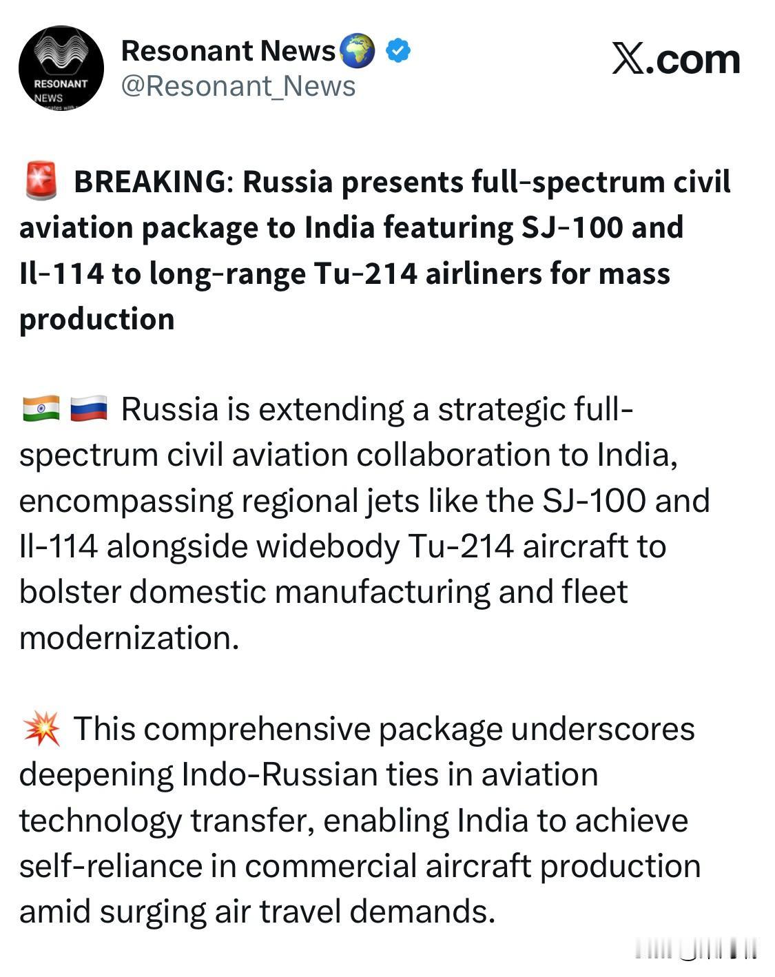 俄罗斯已向印度提出全面的民用航空合作方案,包括SJ-100、伊尔-114等飞机项目,旨在支持印度的“印度制造”倡议,并促进其商用飞机制造业的发展。 合作详情 提议的飞机型号: 俄罗斯向印度提供的飞机型号包括支线喷气式飞机SJ-100、涡桨支线飞机伊尔-114-300以及图-214宽体飞机。 合作目标: 该综合方案的目标是加强印度的国内航空制造业,实现机队现代化,并利用技术转让帮助印度实现商用飞机生产的“自力更生”。 技术转让: 俄罗斯的提议包括100%的技术转让承诺,这对于印度发展本土航空工业的雄心至关重要。 生产本地化: 俄罗斯建议在印度斯坦航空工程公司(HAL)设立伊尔-114-300的生产线,符合印度的“印度制造”计划。 印度航空制造业的挑战与前景 印度的航空旅行需求激增,推动了对商用飞机的巨大需求。然而,印度目前缺乏从头开始制造商用飞机所需的高复杂度零部件生产能力和研发技术,严重依赖波音和空客等全球巨头。 当前状况: 印度目前在全球航空供应链中的贡献率仅为5%,缺乏制造发动机、航电、飞控等核心系统的能力。 合作意义: 与俄罗斯的合作,特别是技术转让,被视为印度提升其航空制造能力并减少对西方制造商依赖的关键一步。 未来展望: 尽管存在挑战,印度政府和企业界仍希望通过与国际伙伴(如俄罗斯)的合作,逐步实现其“自产大飞机”的梦想。 印度对俄罗斯提议的兴趣属实,双方已签署初步协议,计划在印度制造SJ-100客机,这增强了印度对自己生产飞机的信心。