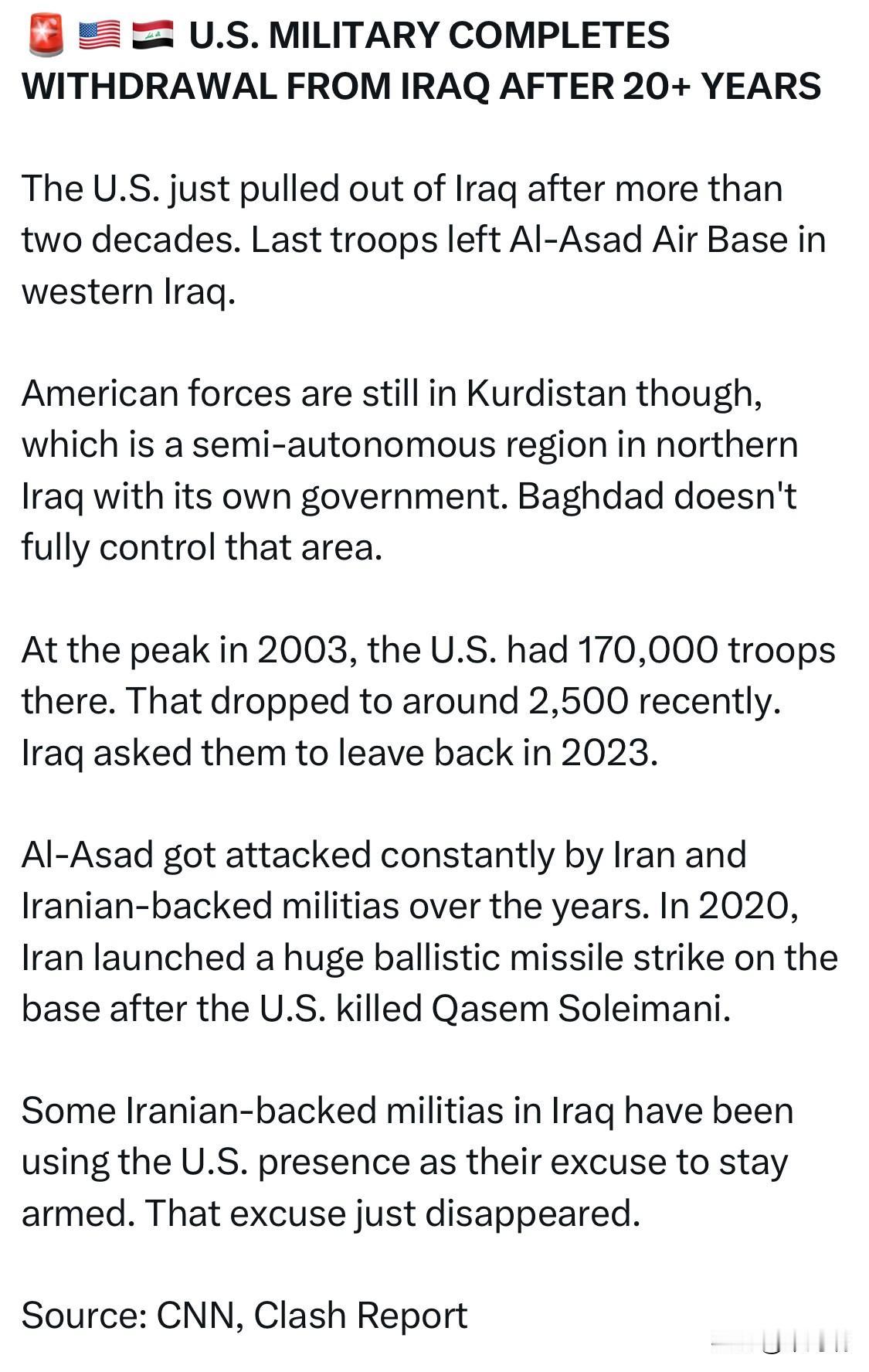 美军在驻扎伊拉克20多年后完成撤军 美国在伊拉克驻军二十余年后终于撤出。最后一批美军撤离了位于伊拉克西部的阿萨德空军基地。 美军仍然驻扎在库尔德斯坦,库尔德斯坦是伊拉克北部一个拥有自己政府的半自治地区。巴格达并未完全控制该地区。 2003年,美军在伊拉克驻扎人数达到顶峰,为17万人。近年来,这一数字已降至约2500人。伊拉克方面于2023年要求美军撤离。 多年来,阿萨德空军基地一直遭受伊朗及其支持的民兵组织的袭击。2020年,在美国击杀卡西姆·苏莱曼尼后,伊朗向该基地发射了大规模弹道导弹袭击。 伊拉克境内一些受伊朗支持的民兵组织一直以美军驻扎为借口继续持有武器。但现在,这个借口已经不复存在了。