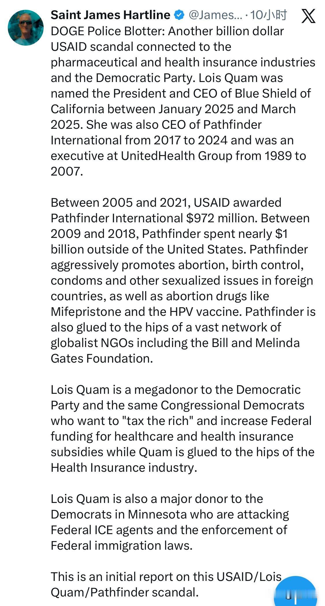 又一起涉及制药、医疗保险行业和民主党的数十亿美元美国国际开发署(USAID)丑闻。洛伊斯·夸姆 (Lois Quam) 于 2025 年 1 月至 3 月担任加州蓝盾保险公司总裁兼首席执行官。她还曾于 2017 年至 2024 年担任 国际探路者(Pathfinder International )首席执行官,并于 1989 年至 2007 年在联合健康集团 (UnitedHealth Group) 担任高管。 2005年至2021年间,美国国际开发署(USAID)向国际探路者组织(Pathfinder International)拨款9.72亿美元。2009年至2018年间,探路者组织在美国境外花费了近10亿美元。探路者组织在海外积极推广堕胎、节育、避孕套和其他性相关议题,以及米非司酮等堕胎药物和人乳头瘤病毒(HPV)疫苗。此外,国际探路者组织还与包括比尔及梅琳达·盖茨基金会在内的庞大全球主义非政府组织网络关系密切。 洛伊斯·夸姆是民主党的超级捐助者,而那些国会民主党人想要“向富人征税”,增加联邦政府对医疗保健和健康保险补贴的资金,但夸姆却与健康保险行业关系密切。 洛伊斯·夸姆也是明尼苏达州民主党的主要捐助者,该党正在攻击联邦移民执法局特工和联邦移民法的执行。 附件资料是关于美国国际开发署/洛伊斯·夸姆/国际探路者丑闻的初步报告。 加州蓝盾保险公司 (Blue Shield of California) 是一家成立于 1939 年、总部位于奥克兰的非营利性健康保险公司,主要为加州居民提供医疗保险服务。它是蓝十字蓝盾协会 (Blue Cross Blue Shield Association) 的独立被许可方之一。 国际探路者 (Pathfinder International) 是一家具备 70 余年历史的全球性非营利组织,致力于确保所有人(尤其是妇女和女青年)都能获得性与生殖健康及权利 (SRHR)。