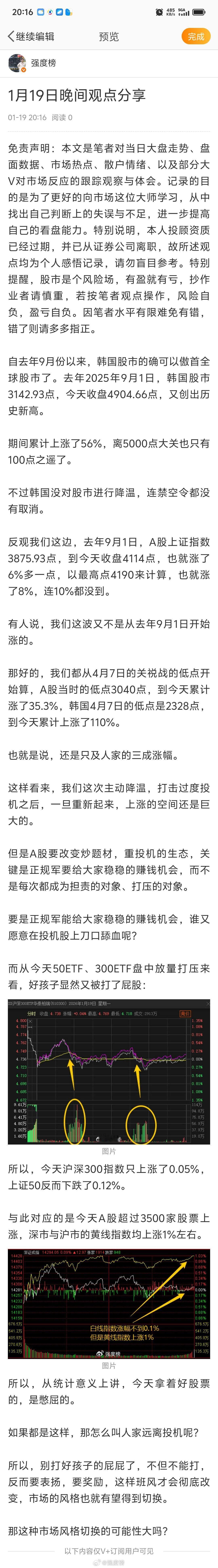 晚间分享 A股[超话] 1月19日晚间观点分享自去年9月份以来,韩国股市的确可以傲首全球股市了。去年2025年9月1日,韩国股市3142.93点,今天收盘4904.66点,又创出历史新高。期间累计上涨了56%,离5000点大关也只有100点之遥了。不过韩国没对股市进行降温,连禁空令都没有取消。反观我们这边,去年9月1日,A股上证指数3875.93点,到今天收盘4114点,也就涨了6%多一点,以最高点4190来计算,也就涨了8%,连10%都没到。有人说,我们这波又不是从去年9月1日开始涨的。那好的,我们都从4月7日的关祱战的低点开始算,A股当时的低点3040点,到今天累计涨了35.3%,韩国4月7日的低点是2328点,到今天累计上涨了110%。也就是说,还是只及人家的三成涨幅。