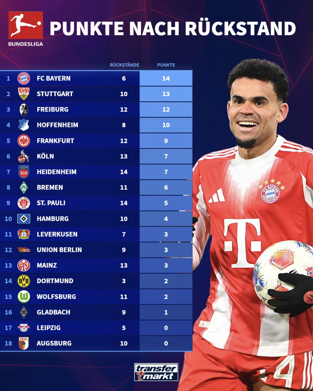 拜仁比分累计落后过6次,但最终抢回了14分排名第一;多特蒙德总共落后过3次,最终抢回2分排名第十四。莱比锡和奥格斯堡本赛季则只要落后就铁定输球,排名倒数。