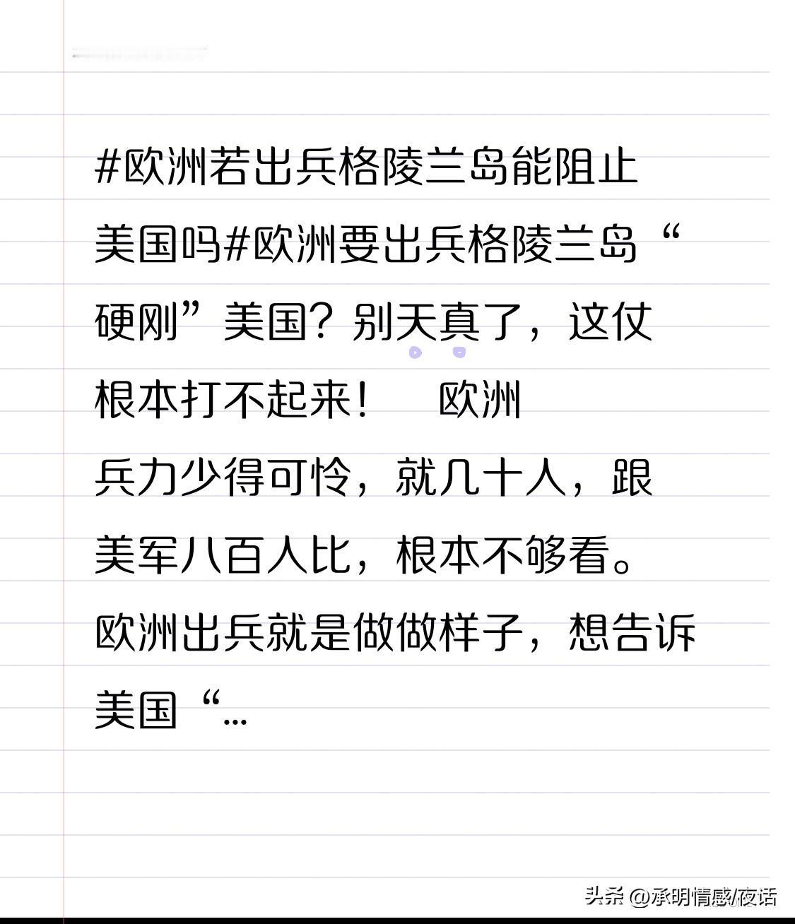 欧洲要出兵格陵兰岛“硬刚”美国?别天真了,这仗根本打不起来! 欧洲兵力少得可怜,就几十人,跟美军八百人比,根本不够看。欧洲出兵就是做做样子,想告诉美国“别乱来”,真打起来它可不敢。北约内部规定,盟友打架它不管,欧洲哪敢真跟美国翻脸。 欧洲这招就是“虚张声势”,想阻止美国没那么容易! 你觉得欧洲还有啥招能治治美国?评论区聊聊,点赞关注不迷路!