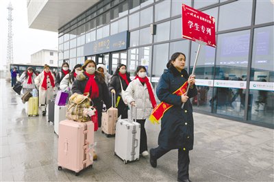 1月19日,乘坐团体包车的大学生在安徽阜阳西站进站乘车。1月19日,G7723次列车从安徽阜阳西站驶出,300余名阜阳高校学子搭乘这趟列车开启寒假回家之旅。这是2026年长三角首趟学生团体包车。新华社发