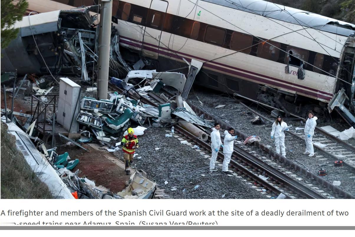 西班牙发生火车相撞事故,造成至少39人死亡,一百多人受伤 当地时间周日晚上7:45,一列载有约300名乘客的高速列车从马拉加开往首都马德里的线路上失控,尾部撞上了一列从马德里开往西班牙南部城市韦尔瓦的列车头部,该列车前两节车厢被撞离轨道,坠落至四米高的斜坡。死亡人数最多的发生在这俩节车厢里。 西班牙警方称,事故已造成39人死亡,159人受伤,24人情况严重,预计死亡人数会持续上升。 西班牙交通部长普恩特周一凌晨表示,事故原因尚不明朗。 据欧盟统计,西班牙拥有欧洲最大的高速列车铁路网络,轨道总长超过3100公里。