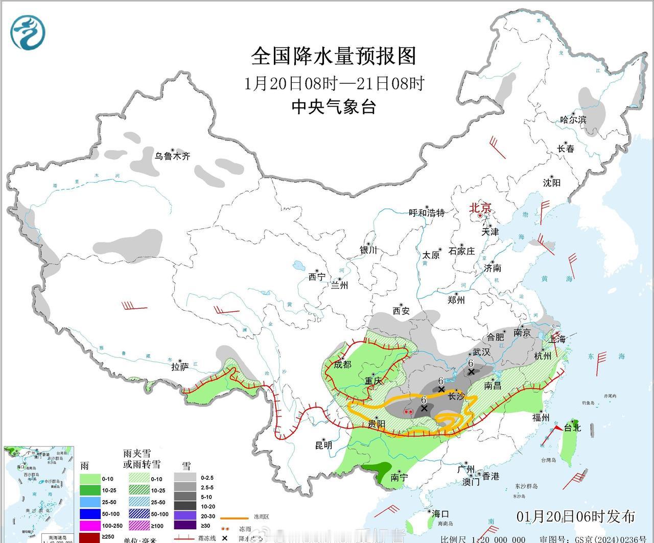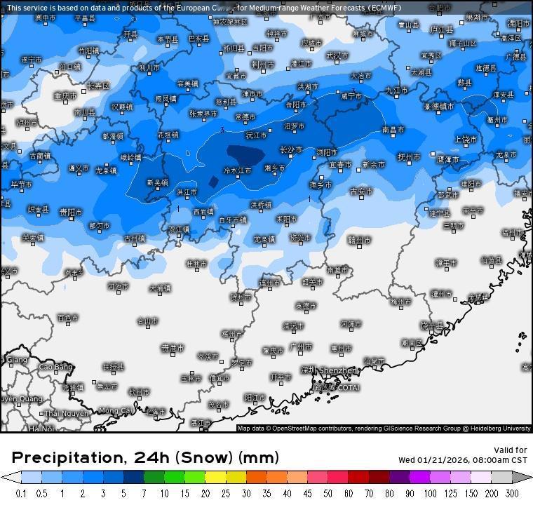 安徽 江苏附近的降雪带将逐渐南压,武汉 合肥 南京一带的较强降雪将在白天逐渐减弱直到结束。而随着寒潮的南下,整体水汽条件也会慢慢变差,雪区进入江南后强度会减弱,最强区可能会位于湖南附近,长沙在冻雨或冰粒后有望迎来中雪,南昌也能出现雨转雪。今天,杭州也可能会出现雨夹雪或雨转小雪,上海会有零星小雪。