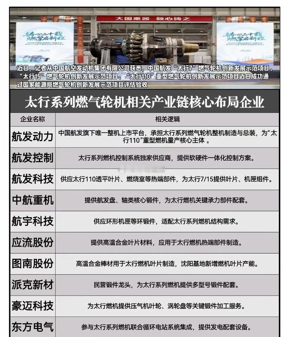 什么是燃气轮机?相关概念龙头代表有哪些?1月19日最新消息,中国航发“太行”系列三款燃气轮机顺利通过国家能源局验收,紧接着,我国自主研制的新型3兆瓦级燃气轮机也正式发布。这标志着我国在高端能源动力装备领域实现了关键技术突破,为能源安全筑牢了坚实根基。那么什么是燃气轮机?相关概念龙头企业有哪些?燃气轮机是高端制造的“皇冠明珠”,以连续流动的气体为工质,将燃料的化学能转化为机械能的旋转式动力机械,是国家能源安全与高端制造能力的“战略基石”。行业龙头代表:国际上美国GE、德国西门子、日本三菱重工垄断,三家合计占据超90%的市场份额。国内行业龙头代表有航发动力、航发控制、应流股份等等。理财有风险入市需谨慎。中国燃气轮机太行燃气轮机燃气轮机排放燃气轮机制造人民日报评美国斩杀线