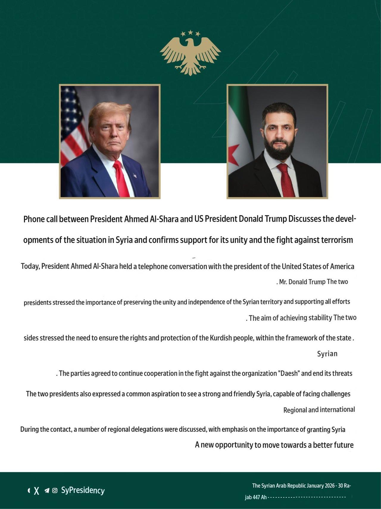 新闻快讯——特朗普与叙利亚总统艾哈迈德·沙拉通电话,就相关局势展开磋商!消息来源