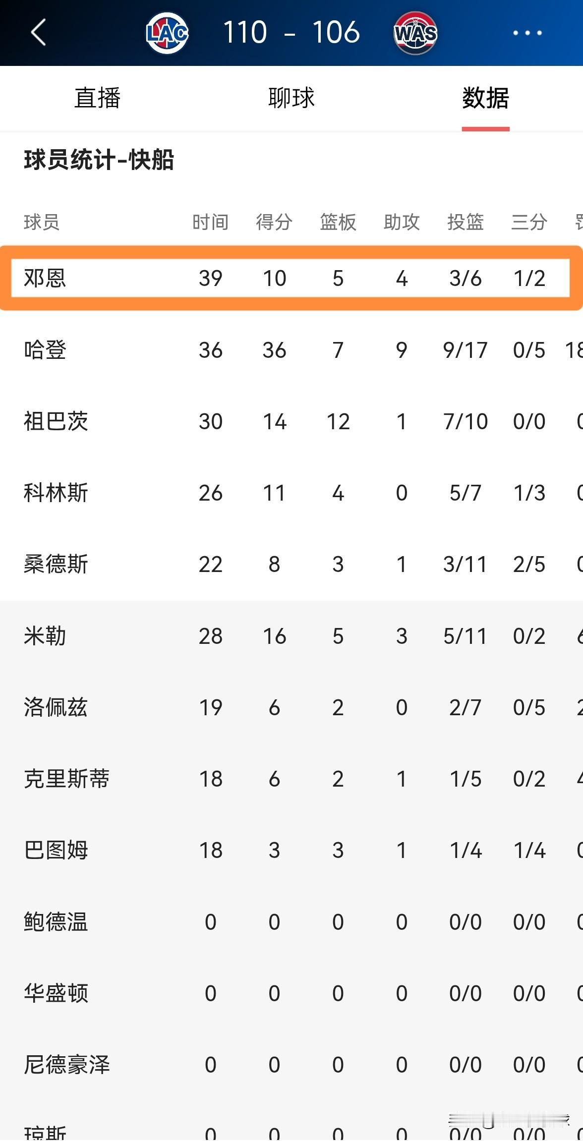 我必须要好好夸夸快船大将邓恩!在今天快船客场以110:106击败奇才的比赛中,邓恩首发出战39分钟,投篮6中3,其中三分球2中1、罚球4中3得到10分5篮板4助攻1抢断1盖帽。本场比赛邓恩最让人称道的地方在于,当哈登被替换下场休息的时候,邓恩非常出色的完成了组织串联的任务,他很好的分担了哈登身上的压力。