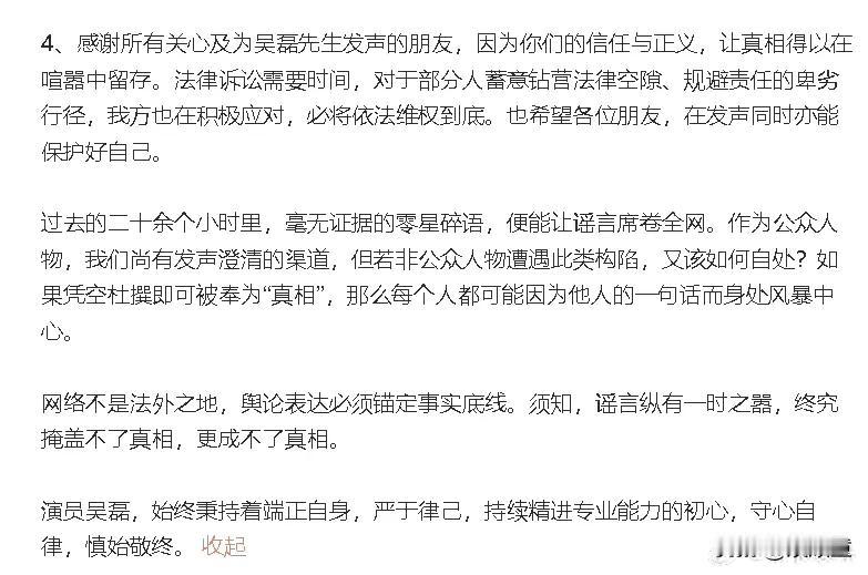 清者自清,吴磊硬杠白珊珊,说到底就是有底气… 吴磊工作室最新回应白珊珊事件,硬气、有力,让人点赞。 面对吴磊工作室的强硬态度,白珊珊公开道歉,并承认自己为了流量,捏造的子虚乌有… 很多人支持,吴磊告到底,网络不是法外之地,白珊珊的行为给吴磊带来的麻烦,以及名誉损失,更不是“对不起”能够轻飘飘解决的!