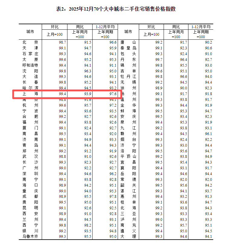 就从城市层面而言,12月份,70个大中城市中,二手住宅价格环比上涨的城市数量为0。其中,上海二手住宅价格自今年5月份起环比连续8个月出现下降,降幅为0.6%,比上月收窄0.2个百分点。此外,从全年来看,2025年上海二手住宅价格同比下降2.4%,降幅为全国第二少,仅高于成都(下降2.2%)。