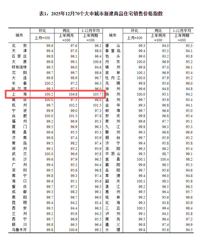 在众多城市中,上海新房价格表现无疑是最为抢眼。12月份,上海新房价格环比上涨0.2%、同比4.8%,是一线城市中唯一实现同比、环比均双涨的城市,且两者涨幅均位列全国第一。值得注意的是,这是上海新房价格连续43个月环比上涨;此外,2025年全年,上海的新房价格均值亦领涨全国,同比上涨5.7%。