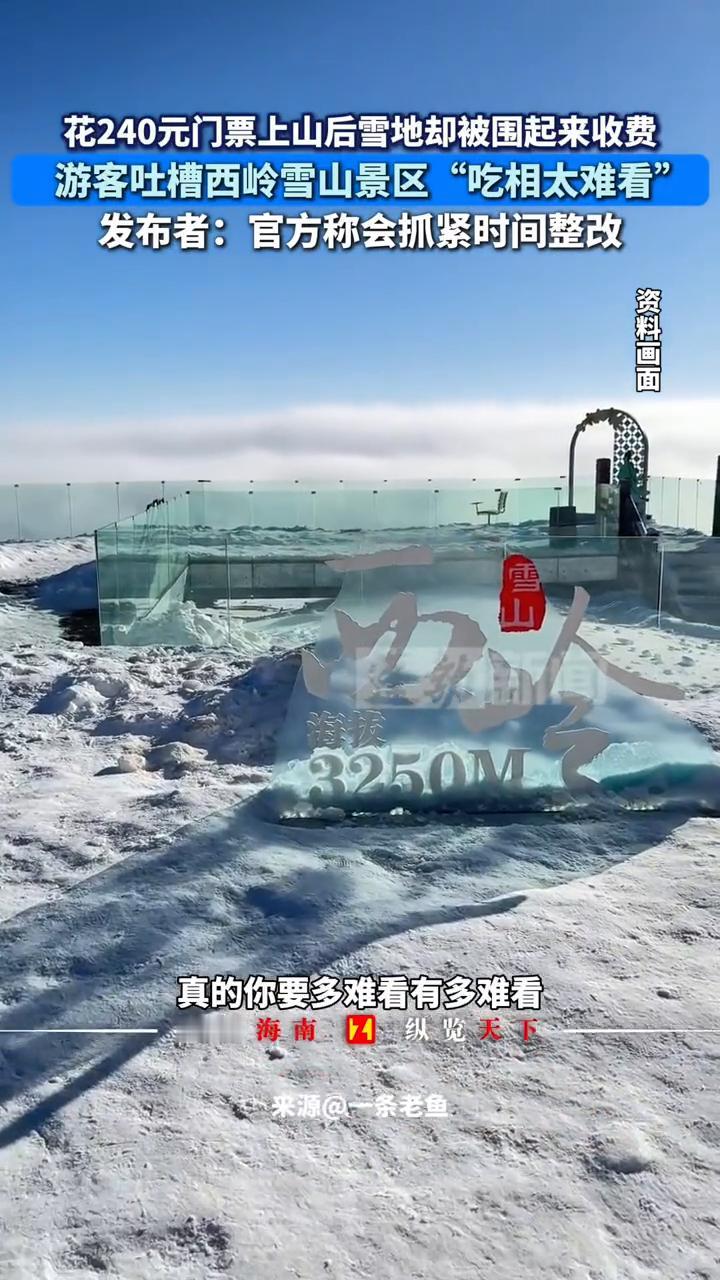花240元门票上山后雪地却被围起来收费,游客吐槽西岭雪山景区"吃相太难看"。 直播海南纵览天下。 1月19日,四川成都。你现在是我见过吃相最难看的景区,真的要多难看有多难看。 我们来西岭雪山玩,到山顶的票240元一张,这被拦起来了,全部单独收费。这什么单人88,这边也是单独收费,就是这边收完88,你要到这边来玩也单独收费,你要到那边玩又要单独收费,你觉得合理吗?进来什么都单独收费。