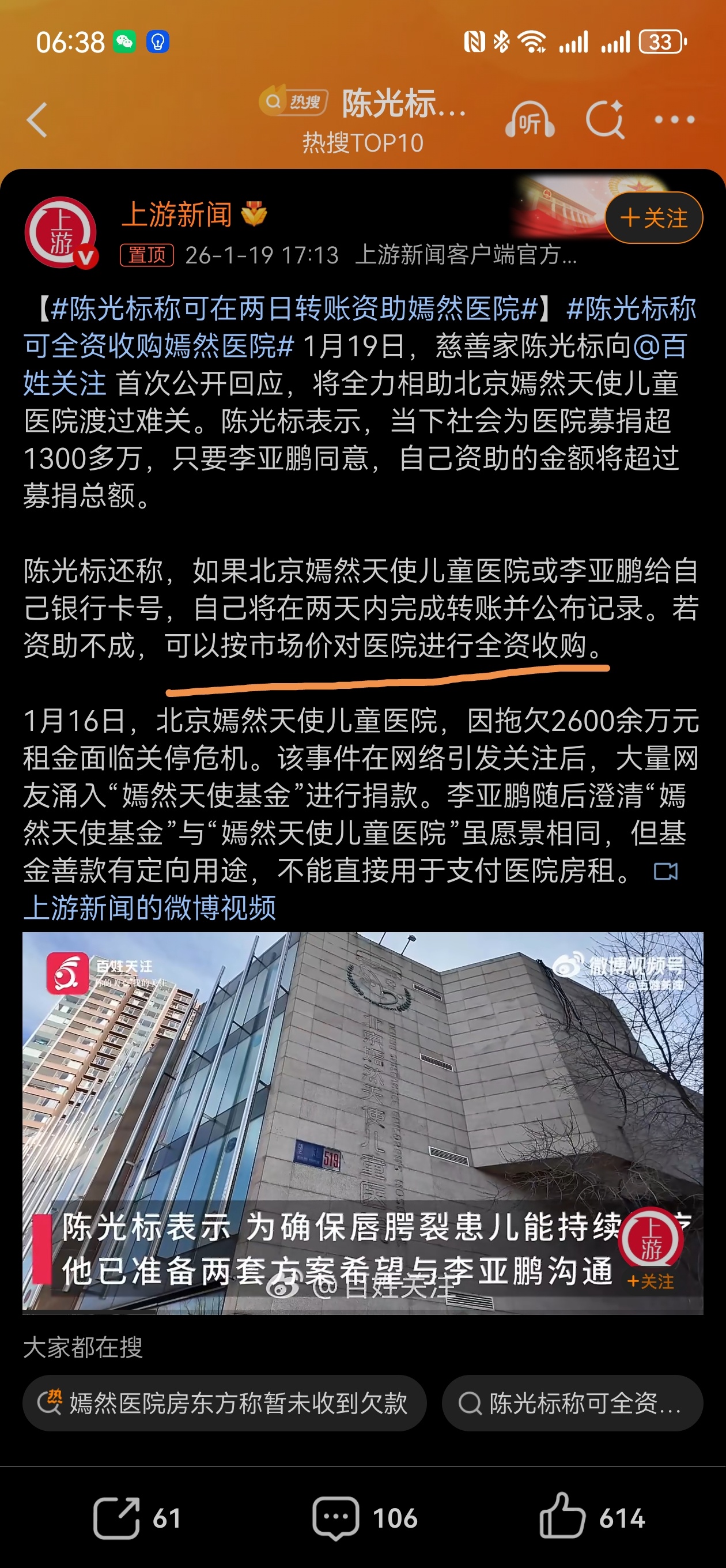 陈光标称可在两日转账资助嫣然医院 厉害了,他要转账超1300万,或者全资收购。这