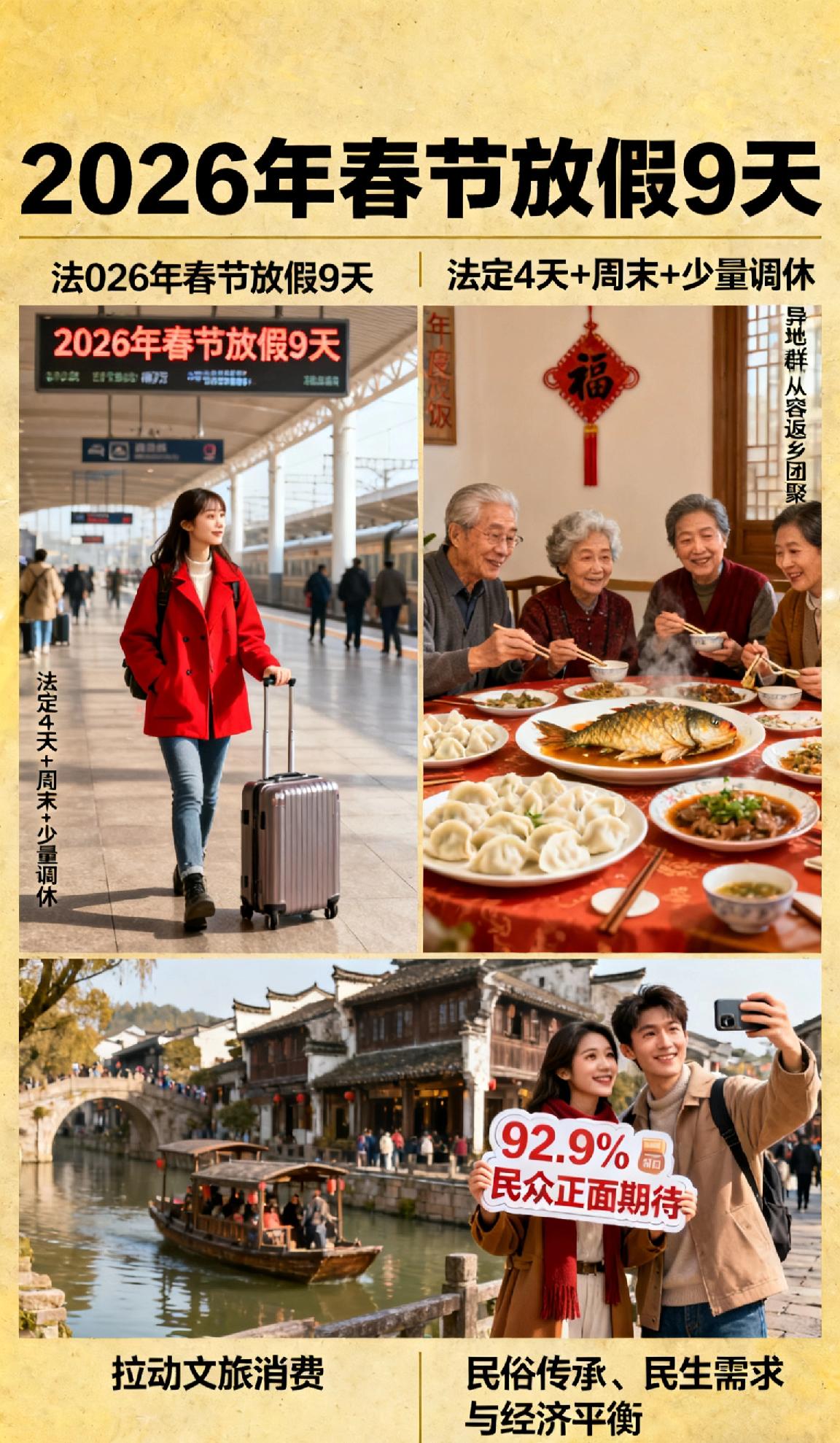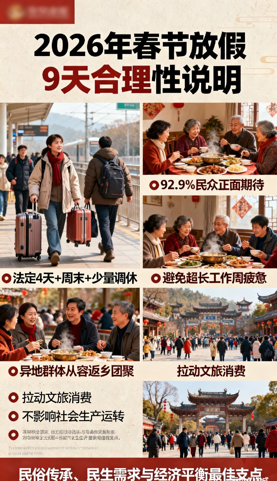 你认为春节放多少天假比较合理我认为春节放9天假最合理。这一安排既回应了92.9%民众的正面期待,法定4天+周末+少量调休的组合,避免了超长工作周的疲惫,能让异地群体从容返乡团聚。同时,充足假期可拉动文旅消费,又不会过度影响社会生产运转,在民俗传承、民生需求与经济平衡间找到了最佳支点。年节假日安排表 春节假期天数