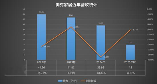 然而,自2022年起,美克家居的业绩急转直下,陷入持续亏损的困境。财务数据显示,2022年至2024年,公司营收从44.96亿元下滑至33.95亿元,归母净亏损从2.89亿元扩大至8.64亿元,三年累计亏损超16亿元。