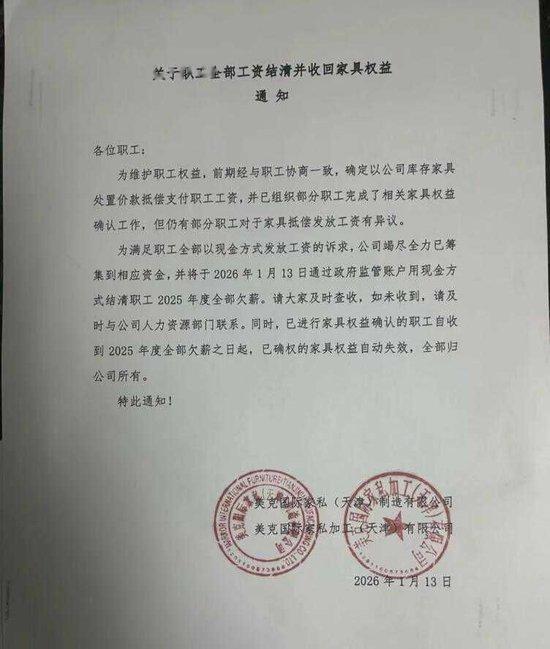 《BUG》栏目了解到工人讨薪最新进展。部分工人不满公司以库存家具抵薪,要求全现金支付。有工人透露,近期,美克美家通过政府监管账户已经结清了2025年全部欠薪,而公司承诺的N倍离职补偿则仍在追讨中。