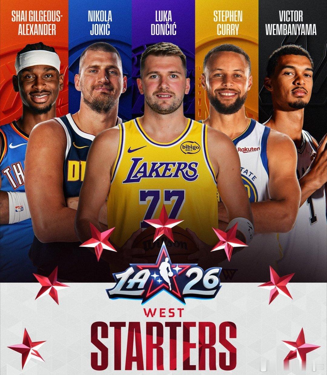 西部全明星首发:东契奇、亚历山大、库里、约基奇、文班亚马东部全明星首发:布伦森、