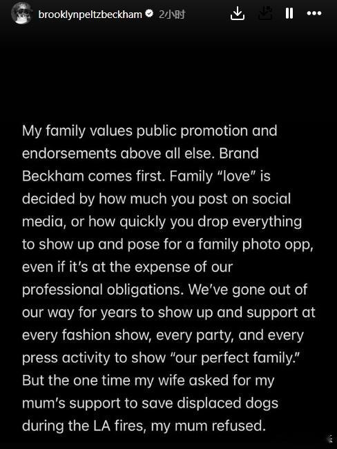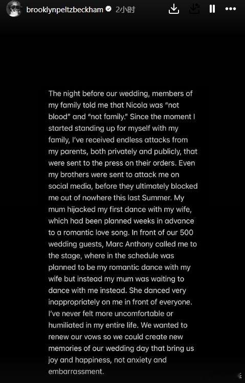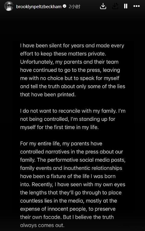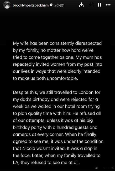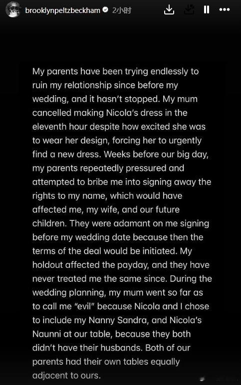 贝克汉姆大儿子说不想与父母和解 发长文控诉父母据,20日凌晨,贝克汉姆大儿子布鲁克林在社交网站发长文控诉父母,并明确表示不想与家人和解,“人生中第一次为自己挺身而出。”↓1.母亲维多利亚在婚礼前最后一刻取消为妻子妮可拉设计婚纱的计划。2.父母在婚礼前施压让他签署放弃“贝克汉姆”姓氏使用权的协议。3.家人多次贬低妻子,称其“不是血亲”、“不算家人”。4.婚礼当天,母亲维多利亚抢走原定由他与妻子共舞的第一支舞。5.父亲贝克汉姆50岁生日时,拒绝与其私下见面,除非不带妻子且在公开派对上露面。6.全家将“贝克汉姆品牌”置于亲情之上,要求子女牺牲工作配合宣传。7.否认“被妻子控制”的说法,实则是长期受父母控制。