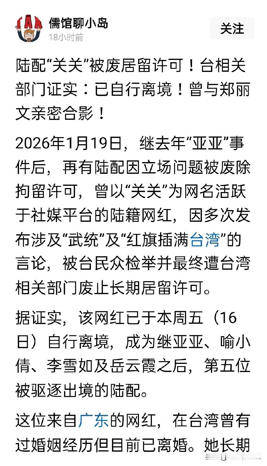 又一个陆配遭到台湾的迫害自行返回大陆 对于这在台湾因言获罪而被迫自行离境的陆配来说,如何保护他们的说话权利 对于这几个陆配来说,有子女的牵挂,回来之后因此有所顾忌基本都选择了低调 也许只有统一了,这样的问题才不是问题
