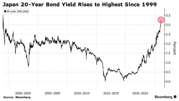 周一,20年期国债收益率触及3.265%,创1999年以来最高水平;30年期与40年期国债收益率亦升至发行以来峰值。