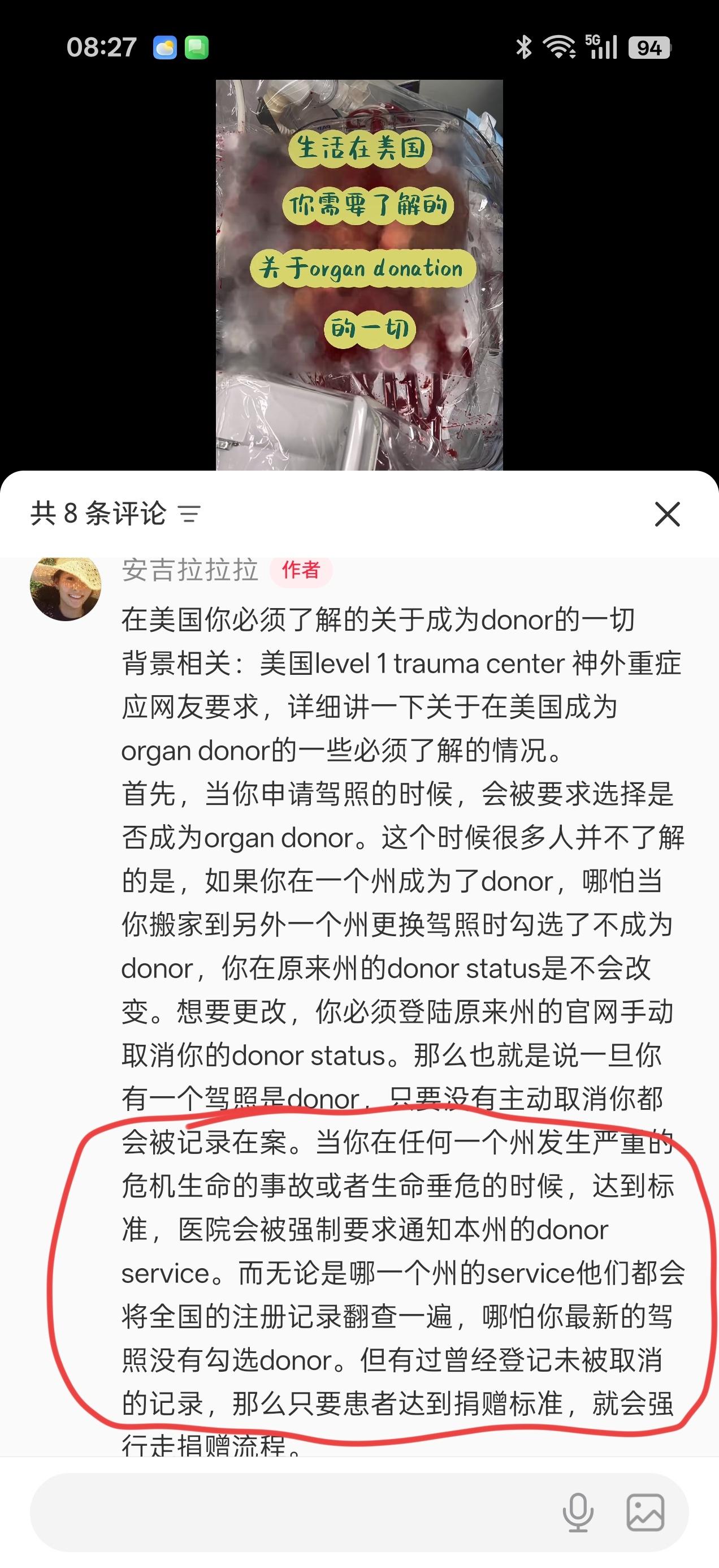 我在隔壁🍠还刷到一个在美国的医生说“一次同意,全国有效”大概意思是:如果你曾在A州申领驾照的时候打过√,后面在B州重新办驾照的时候没有打√,但是又没有主动申请注销A州打过的√,那么,在发生不测的时候,他们因为系统里面存在你在A州打√的记录,认为你同意捐献,然后强制进入流程。。。不论在哪个州就好像你在上小学的时候说了一句“我长大以后要每天吃大肉包子”,系统就强制你在18岁以后每天吃大肉包子。。。这也太狠了。。牢A提醒留学生办证不要勾捐献