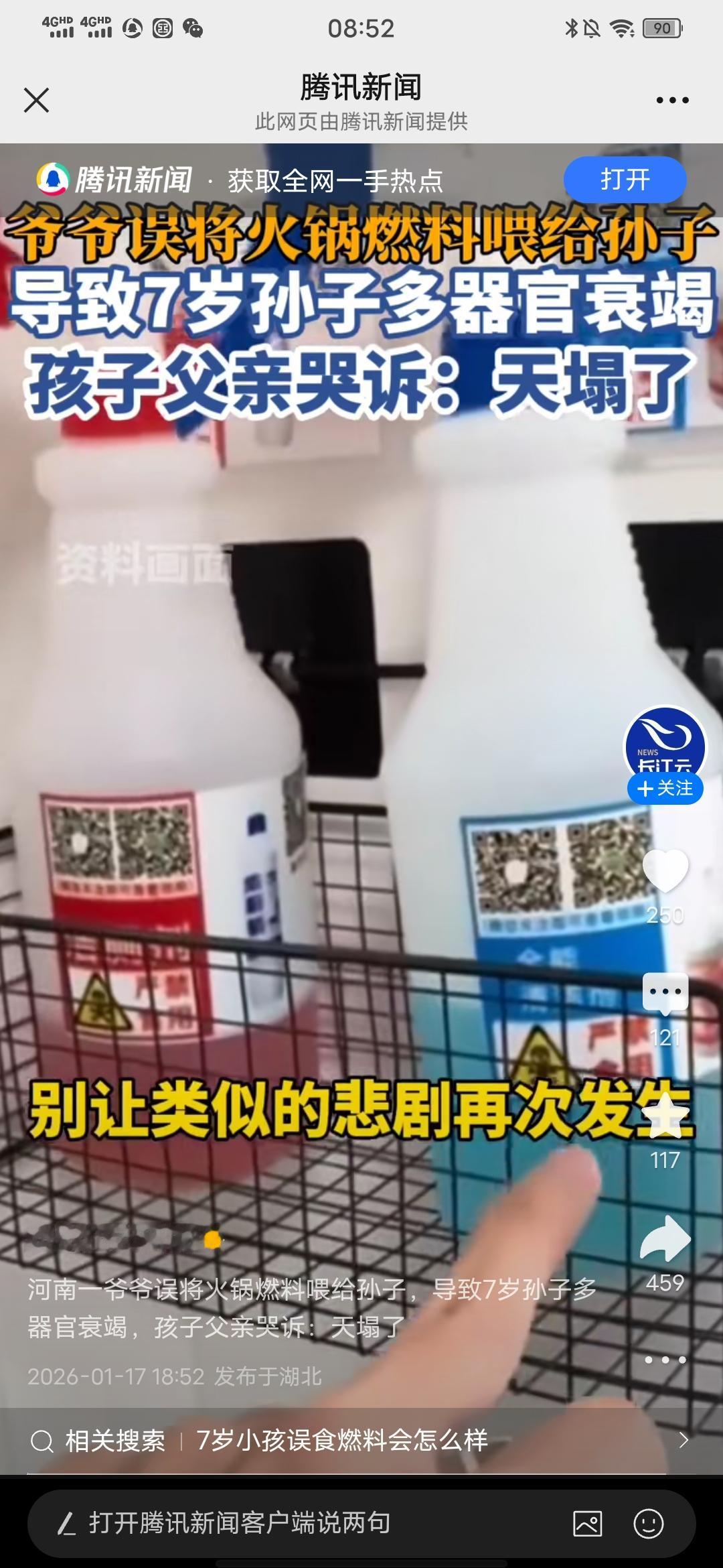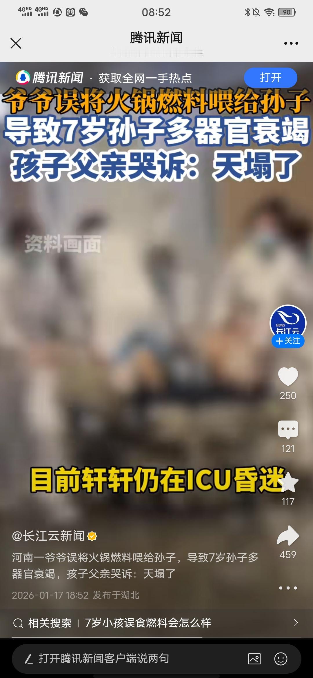 这简直太大意了哦! 刚在长江云新闻平台看到这个让人痛心的消息,河南郸城县的一位爷爷误将火锅燃料喂给孙子,导致7岁孙子多器官衰竭,今早看到了孩子父亲哭诉视频,他哭着说:天塌了! 起因是7岁的孩子感冒了,爷爷在家里随手找到一瓶“矿泉水”,兑了温水,然后给孩子冲感冒药。孩子一口气喝完后,感觉味道不对,这才发现,那根本不是水,而是父亲带回来的火锅燃料,准备一家人在家吃火锅用的,是无色矿物油燃料,这下全家都慌了,孩子父亲紧急将孩子送往医院,不到一个小时,孩子就开始发生各项反应,呕吐,昏迷,最后被诊断为急性肝衰竭和肾衰竭。病情太危重了,只好连夜转到郑州医院,目前,孩子仍在昏迷,依靠呼吸机和血液净化维持生命。 多可怜的孩子,其实,家里有孩子的,真的得特别注意各方隐患,什么小颗的固形物,得防孩子误吞,什么有毒液体,包括一切厨房卫生间用清洁剂什么的,都应该远离孩子,并且教会孩子这些东西的危险性,比如,无色无味,易混淆的东西,切记做好标签,与能入口的东西分离开,切不可随意乱放啊! 另外,这爷爷肯定也是个勤俭节约的人,舍不得扔没用完或没喝完的东西那种,可见,平时也是在这方面不注意的,就算是真的“矿泉水”开封过后,特别是夏天,放置一小时后就已经滋生了很多细菌了,再饮用很大概率会闹肚子,虽然现在是冬天,但开封长时间了,继续饮用还是会有隐患的。 说到底,这孩子遭此一劫,还是大人们太大意的原因造成的,首先,父亲带回家的时候,没有跟家人交代清楚是什么东西,做什么的,更没有妥善保管,随处乱放。第二,孩子爷爷在兑温水的时候,这开水冲进燃料油时不可能没有气味,多多少少会有些气味,怎么就没有发现呢?其实,家中不管有么有孩子,都应该小心谨慎保管特殊物品,如被老人误食,后果也是一样严重的! 所以,孩子父亲哭诉,天塌了,你对孩子的心疼可以理解,都是当父母的嘛,但是,以后你最该吸取教训,对于任何危险物品,都要妥善保管啊! 最后,祝愿可怜的孩子,尽快好起来!早日康复!