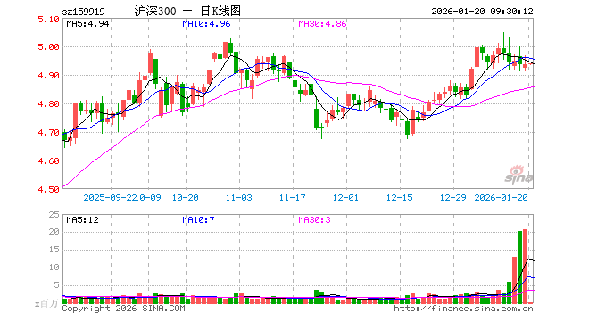 1月20日,沪深300ETF(159919)开盘涨0.00%,报4.937元。沪深300ETF(159919)重仓股方面,宁德时代开盘涨0.32%,贵州茅台涨0.25%,中国平安涨0.08%,招商银行涨0.05%,紫金矿业涨0.00%,新易盛跌0.41%,中际旭创涨0.00%,美的集团涨0.05%,东方财富跌0.04%,长江电力涨0.00%。