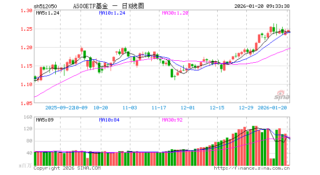 1月20日,A500ETF基金(512050)开盘涨0.00%,报1.241元。A500ETF基金(512050)重仓股方面,宁德时代开盘涨0.32%,贵州茅台涨0.25%,中国平安涨0.08%,招商银行涨0.05%,紫金矿业涨0.00%,新易盛跌0.41%,中际旭创涨0.00%,美的集团涨0.05%,东方财富跌0.04%,长江电力涨0.00%。