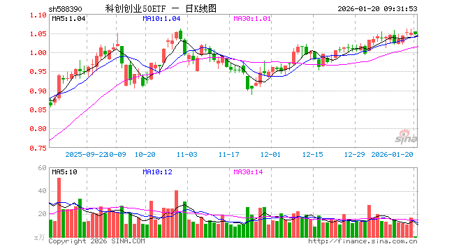 1月20日,科创创业50ETF(588390)开盘涨0.38%,报1.053元。科创创业50ETF(588390)重仓股方面,宁德时代开盘涨0.32%,新易盛跌0.41%,中际旭创涨0.00%,中芯国际跌0.23%,寒武纪跌0.19%,阳光电源跌0.29%,海光信息涨1.97%,澜起科技跌0.68%,胜宏科技跌0.90%,汇川技术跌0.32%。