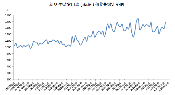 2025年12月份,新华·中盐食用盐(商超)价格指数报1389.00点,较上期(2025年11月)上涨102.08点,涨幅7.93%;较基期(2018年1月)上涨389.00点,涨幅38.90%;较周期内最高点1445.75点(2024年7月)下跌56.75点,跌幅3.93%;较周期内最低点981.91点(2018年12月)上涨407.09点,涨幅41.46%。