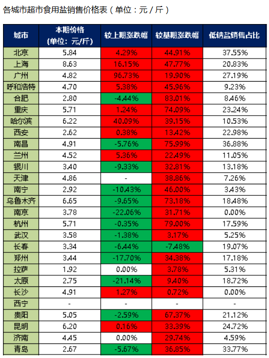 分价格区间来看,本期超市食用盐销售单价在5元/斤以上的城市有8个,分别是北京、上海、重庆、哈尔滨、乌鲁木齐、杭州、贵阳、昆明;超市食用盐销售单价在4-5元/斤之间的城市有7个,分别是广州、呼和浩特、南昌、兰州、天津、长沙、济南;超市食用盐销售单价在3-4元/斤之间的城市有5个,分别是银川、南京、武汉、长春、郑州;超市食用盐销售单价在3元/斤以下的城市有6个,分别是合肥、西南、南宁、拉萨、太原、青岛。