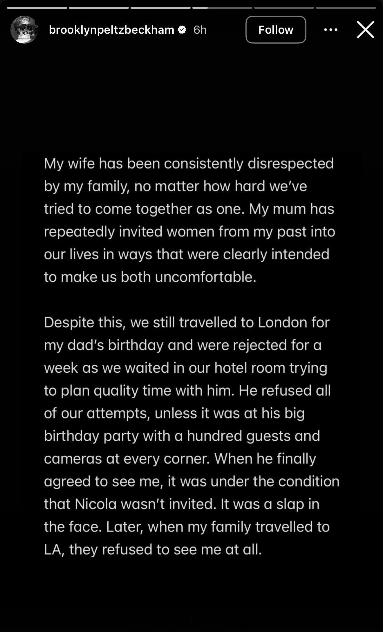 布鲁克林:计划好的婚礼上的第一支舞是和妻子,但妈妈跳出来和我跳了那支舞。在那么多宾客前不合时宜的舞蹈,是对我的羞辱和对我妻子的不尊重。哇哦布鲁克林好恨母亲维多利亚啊他尤其不满意家人对妻子长久的不尊重,并且表示与外界舆论不同,操控他的从来不是妻子而是家人不知全貌不予置评,但没有“贝克汉姆”这个姓氏的话,他应该娶不到妮可拉贝克汉姆遭大儿子控诉