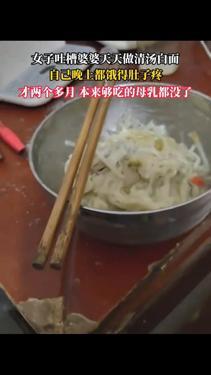 女子吐槽婆婆天天做清汤自面,自己晚上都饿得肚子疼,才两个多月,本来够吃的母乳都没了。 1月18日发布。一只手抱娃,一只手吃饭,婆婆天天做这种饭,每天晚上饿的肚子疼,才两个多月,本来够吃的奶水,现在一滴都没有了。我的宝贝真的很可爱,为什么这样对我们?你们想吃吗?