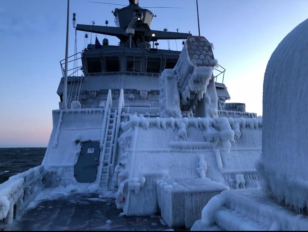 这是德国的科伦瑞克级轻型护卫舰,停靠在北极附近,整个船都冻成了“冰棍”。 在冬季北极的低温高湿环境下,海浪扑溅和降雪会让船体、甲板、主炮、雷达等装备被冰层包裹。 军舰如果没有破冰能力就只能待在原地,就算有破冰能力,冰层也会增加舰体重量、影响稳定性,还会让雷达和武器系统失效。除非用除冰液和手锤来敲碎冰凌,才能保证设备正常工作。 当然,有部分北极附近的国家建造的现代极地舰艇会采用冰级加固船体、加热管路和防冰涂层,部分军舰还配备了自动除冰系统。