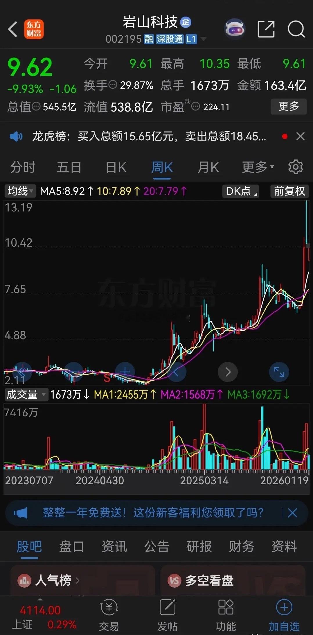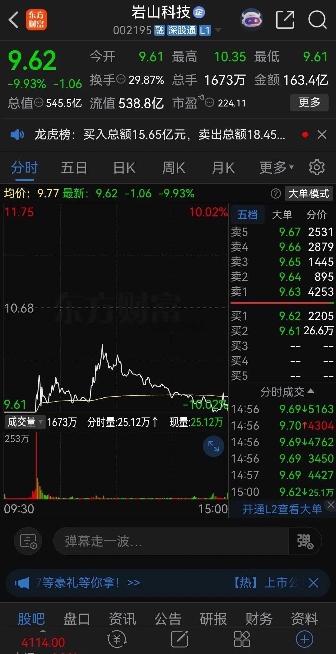 岩山科技又“埋”了一大批抄底的股民!昨天是岩山科技第三个跌停,早盘一度高达460万手的封单牢牢封死跌停,没想到上午10点左右突然有大单撬板,跌停被打开后,抄底资金疯狂涌入,因为是热门人气股,不断有散户加入抄底大军,股价也一度拉升至-3%,不少股民还以为要上演地天板,别提多高兴了。然而一波急拉过后,股价又快速回落,随后一路震荡下跌,尾盘几乎又打回原形,仅比跌停价高一分钱报收,成交额高达163.4亿元,昨天抄底的股民被来了个一锅端,几乎全被“埋”!公司股价一年多时间上涨了6倍多,现在才两三个跌停,仍然还在山顶,不知道抄底的股民哪来的勇气?再说主力打开大门能让散户轻易抄到的底就不是底!不出意外的话,接下来就是阴跌,“温水煮青蛙”的过程,等散户熬不住割肉的时候,它又起一波,来回收割!