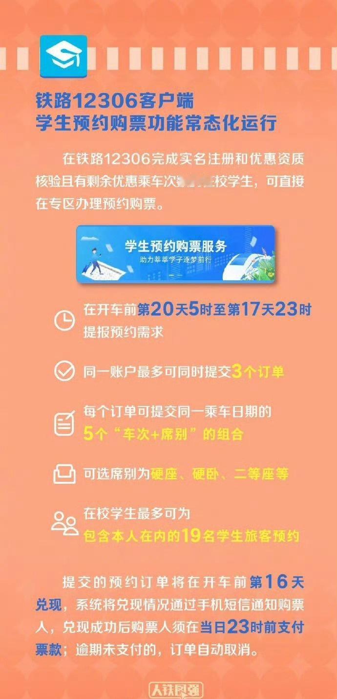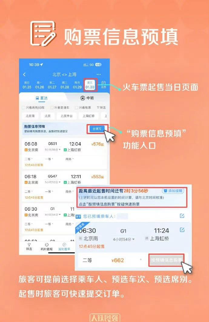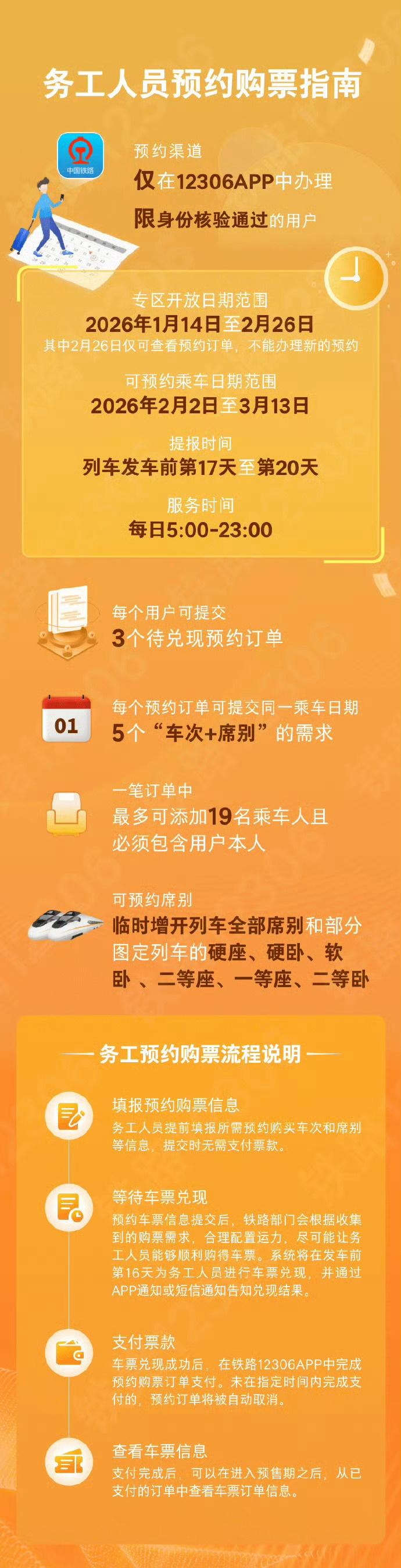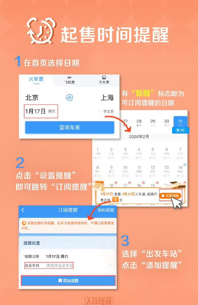 今天是1月20日,可以购买2月3日春运首日火车票。快定好闹钟,准时买票2026铁路春运购票日历转发+收藏,日历在手,出行无忧! ⭐起售时间查询⭐打开铁路12306App→选择“我的”→点击“起售时间”,输入车站和日期后,可查询该车站当日起售时间,也可以在下方查看全部车站起售时间。 ⭐起售时间提醒⭐打开铁路12306App→首页选择日期→选择要乘车日期→点击“设置提醒”,即可跳转“订阅提醒”→选择“出发车站”后,点击“添加提醒”即可。 ⭐购票信息预填⭐在车票起售当日,预先填写乘车人、车次、席别等信息,在车票开始发售时,一键提交订单即可。 ⭐旅客误购限时免费退票⭐旅客通过铁路12306平台购买乘车日期为2月3日及以后火车票时,如误购车票在购票支付成功30分钟内且在开车前4小时以上,购票人可线上自助办理退票,不收取退票费。 铁路部门提示,铁路12306网站(含手机客户端)是中国铁路唯一官方火车票网络售票平台,致力于为广大旅客提供公平公正、安全便捷的购票出行服务,从未与任何第三方平台机构开展合作,没有任何购票加速包、购票会员费、挑选车厢座位费等额外收费,发生改签、退票时严格按规定办理,同时严格依法保护旅客个人信息安全。请广大旅客朋友一定要通过铁路官方渠道购票,认准12306官方网站和“铁路12306”官方App。(中国铁路)