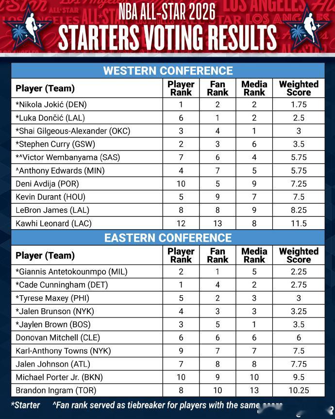 2026NBA全明星东部首发2026nba全明星西部首发詹姆斯连续21年入选全明星首发纪录终结 NBA全明星首发出炉!西部全明星首发为东契奇,库里,亚历山大,文班亚马,约基奇东部全明星首发为字母哥,坎宁安,布伦森,杰伦布朗,马克西詹姆斯21年来首次无缘全明星首发