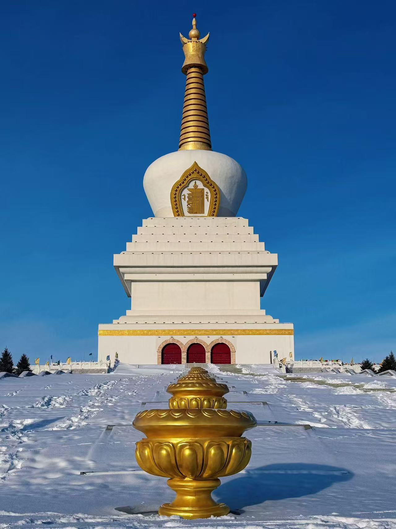 📍 呼伦贝尔市海拉尔区正北的敖包山山顶,是两河圣山旅游文化景区的核心建筑。塔高88.888米,建筑海拔744.7米,由塔基、塔身、相轮、刹顶组成,共有九层。其塔基由汉白玉大理石砌筑,相轮外喷金黄色氟碳漆,在白雪的映衬下格外庄严璀璨。